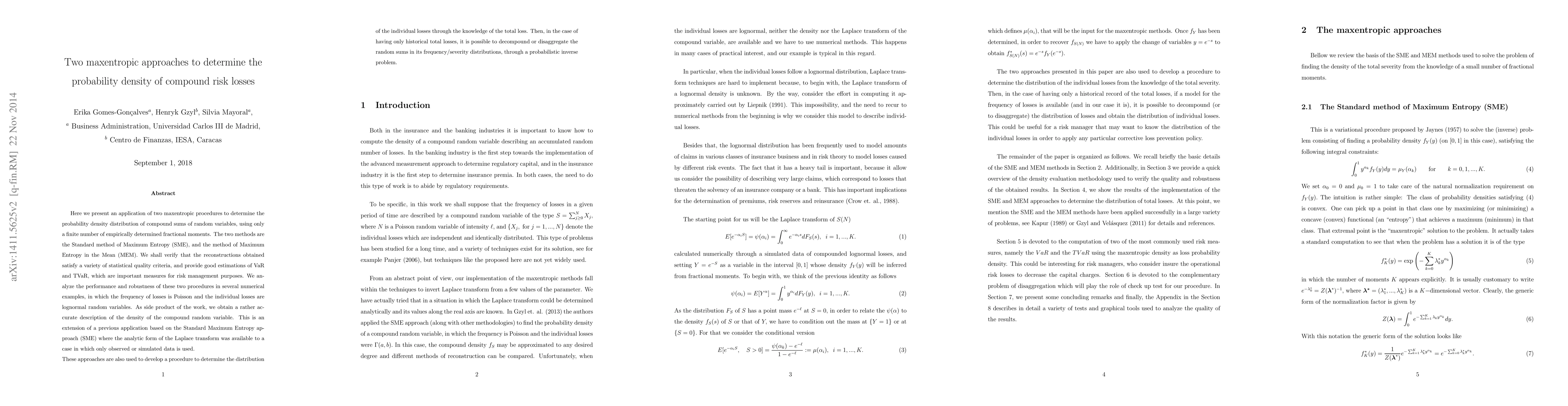 Here we present an application of two maxentropic procedures to determine the probability density distribution of compound sums of random variables, using only a finite number of empirically determined fractional moments. The two methods are the Standard method of Maximum Entropy (SME), and the method of Maximum Entropy in the Mean (MEM). We shall verify that the reconstructions obtained satisfy a variety of statistical quality criteria, and provide good estimations of VaR and TVaR, which are important measures for risk management purposes. We analyze the performance and robustness of these two procedures in several numerical examples, in which the frequency of losses is Poisson and the individual losses are lognormal random variables. As side product of the work, we obtain a rather accurate description of the density of the compound random variable. This is an extension of a previous application based on the Standard Maximum Entropy approach (SME) where the analytic form of the Laplace transform was available to a case in which only observed or simulated data is used. These approaches are also used to develop a procedure to determine the distribution of the individual losses through the knowledge of the total loss. Then, in the case of having only historical total losses, it is possible to decompound or disaggregate the random sums in its frequency/severity distributions, through a probabilistic inverse problem.