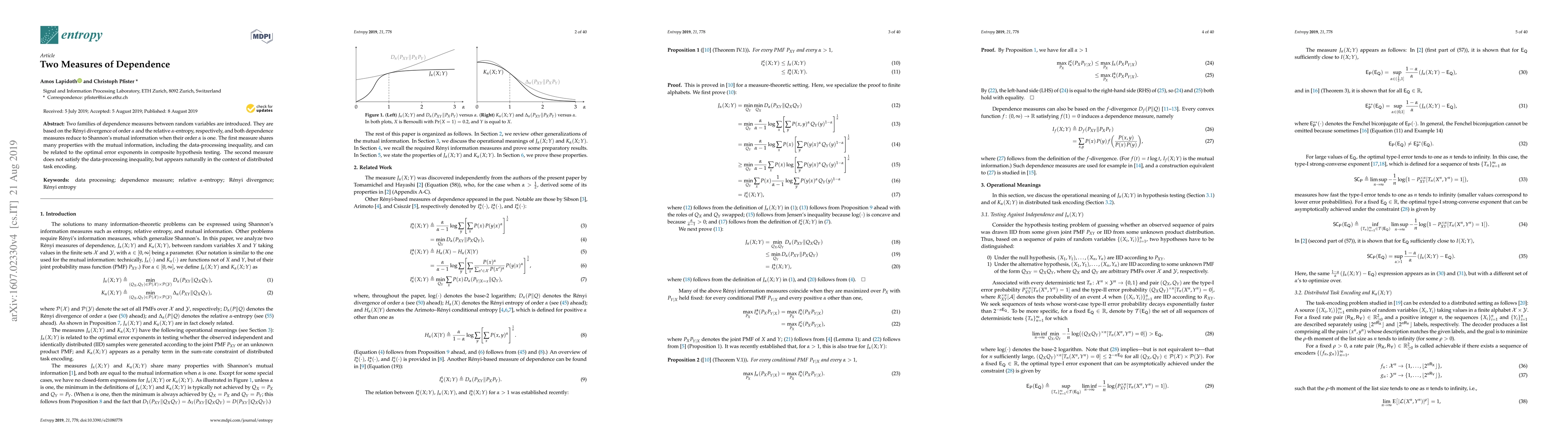 This paper introduces two families of dependence measures based on Rényi divergence and relative α-entropy, both reducing to Shannon's mutual information when α=1. The first measure shares properties like the data-processing inequality, while the second, though lacking this property, is relevant in distributed task encoding.
