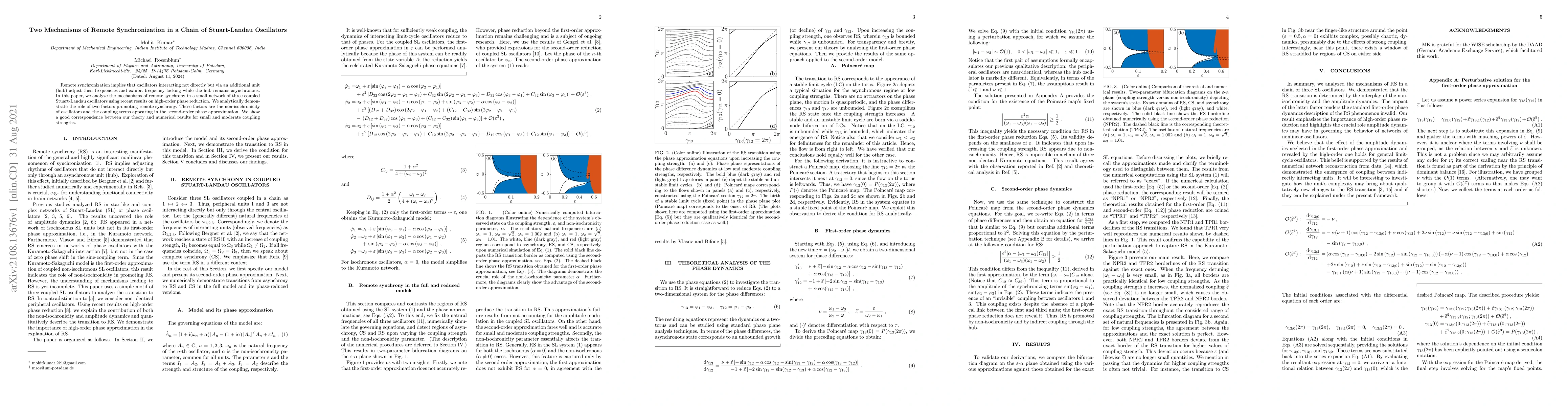 This paper investigates remote synchronization in a chain of Stuart-Landau oscillators via a hub, identifying two key mechanisms: non-isochronicity of oscillators and second-order coupling terms. Theoretical analysis aligns well with numerical simulations for varying coupling strengths.