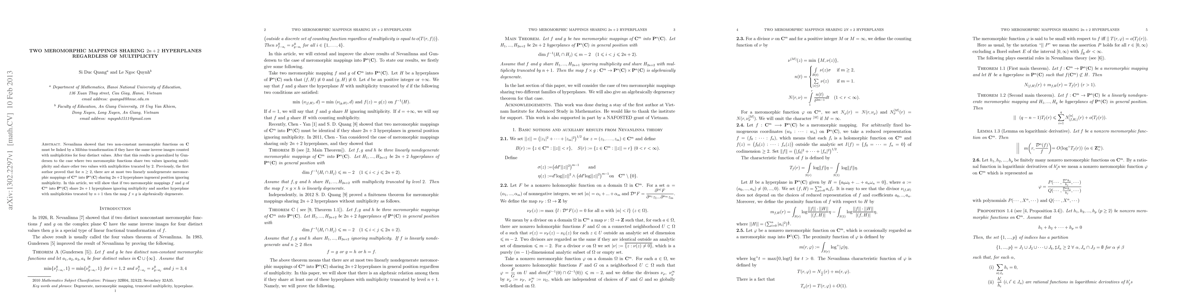 This paper extends the results of Nevanlinna and Gundersen on the relationship between meromorphic mappings sharing hyperplanes. It proves that if two such mappings share $2n+1$ hyperplanes ignoring multiplicity and another with multiplicity truncated by $n+1$, then their product is algebraically degenerate.