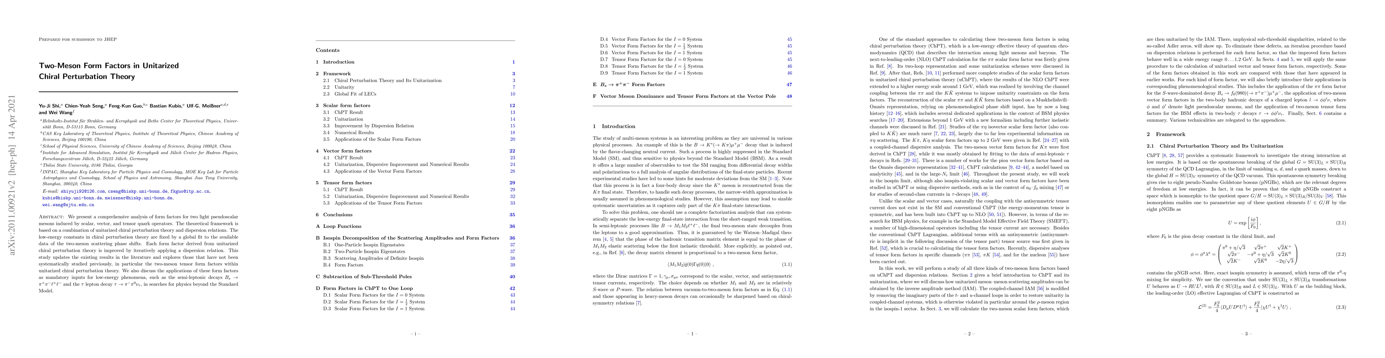 This paper analyzes form factors for two light pseudoscalar mesons using unitarized chiral perturbation theory and dispersion relations, updating existing results and exploring tensor form factors. Applications include semi-leptonic decays and tau lepton decay, crucial for probing physics beyond the Standard Model.