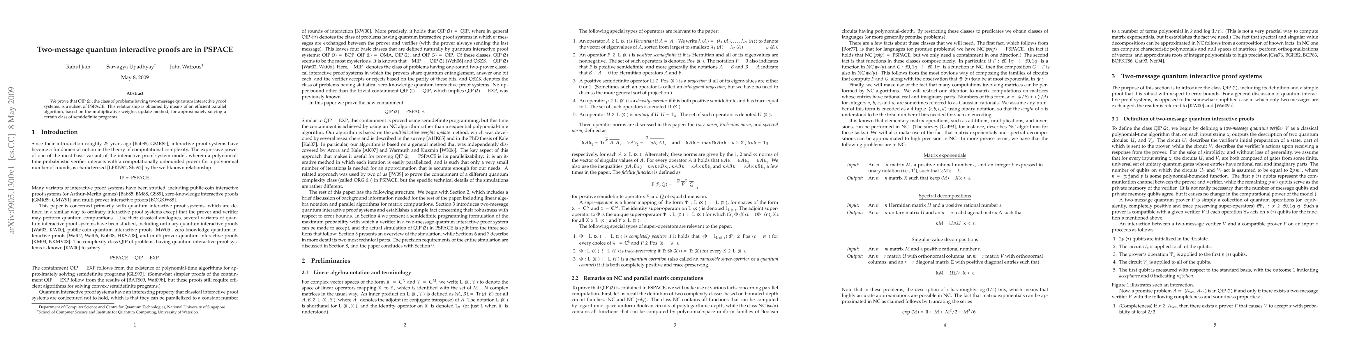 Summary: The paper demonstrates that QIP(2), the class of problems verifiable by two-message quantum interactive proofs, is contained within PSPACE. This result is achieved through an efficient parallel algorithm utilizing the multiplicative weights update method to solve a specific class of semidefinite programs.