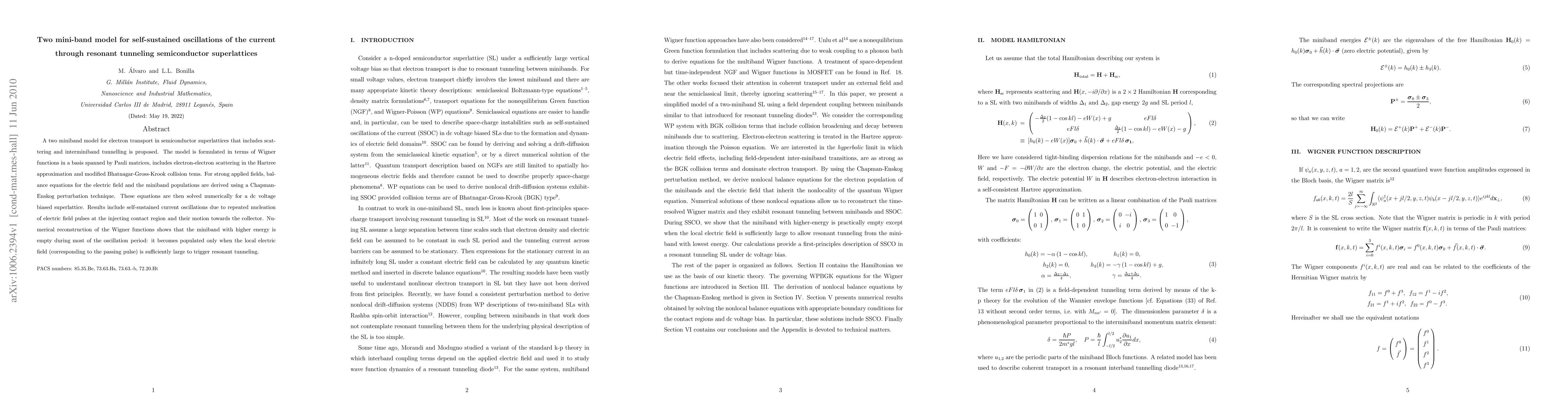 This paper proposes a two miniband model for electron transport in semiconductor superlattices, incorporating scattering and interminiband tunneling. It predicts self-sustained current oscillations due to the repeated nucleation of electric field pulses, with the higher energy miniband remaining mostly empty until triggered by a large local electric field.