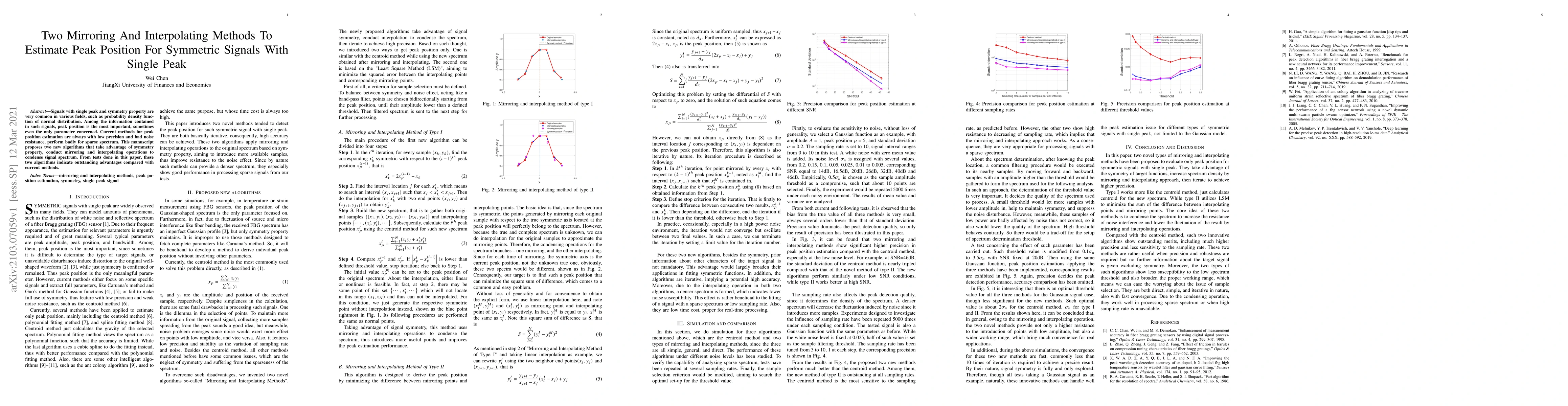 Two new algorithms propose mirroring and interpolating methods to estimate peak position in symmetric signals with a single peak, offering improved precision and noise resistance over existing methods.