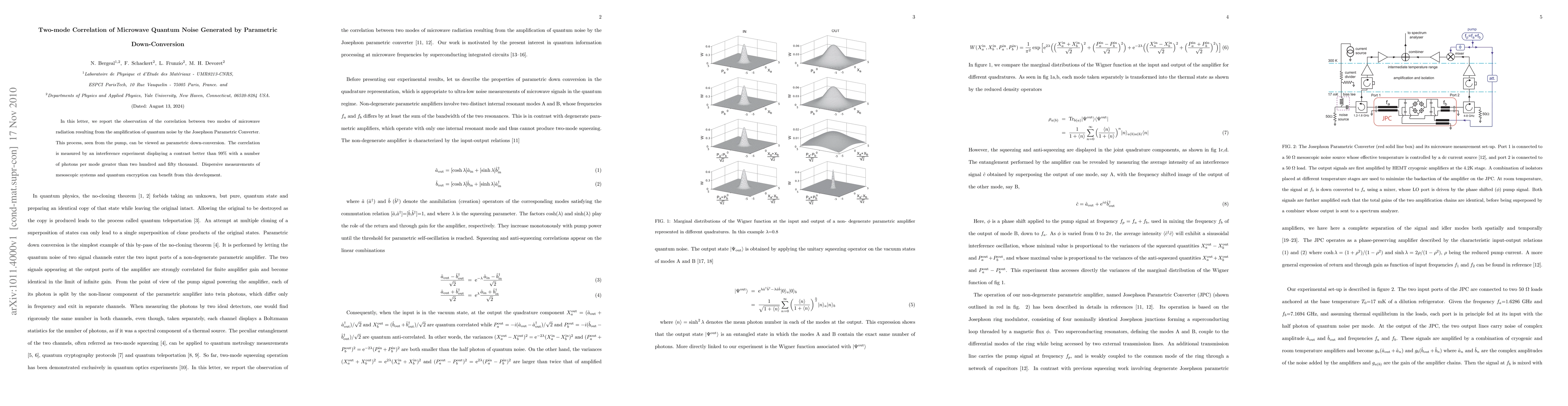 In this letter, we report the observation of the correlation between two modes of microwave radiation resulting from the amplification of quantum noise by the Josephson Parametric Converter. This process, seen from the pump, can be viewed as parametric down-conversion. The correlation is measured by an interference experiment displaying a contrast better than 99% with a number of photons per mode greater than two hundred and fifty thousand. Dispersive measurements of mesoscopic systems and quantum encryption can benefit from this development.