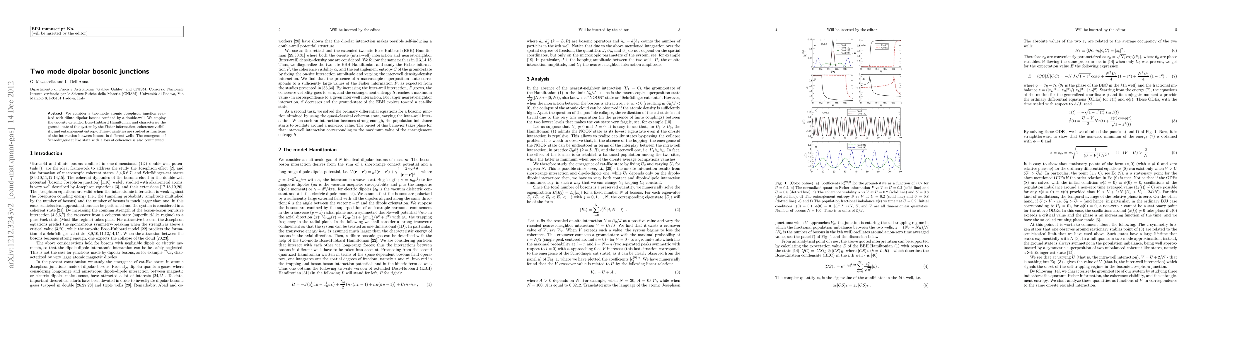 We consider a two-mode atomic Josephson junction realized with dilute dipolar bosons confined by a double-well. We employ the two-site extended Bose-Hubbard Hamiltonian and characterize the ground-state of this system by the Fisher information, coherence visibility, and entanglement entropy. These quantities are studied as functions of the interaction between bosons in different wells. The emergence of Schroedinger-cat like state with a loss of coherence is also commented.