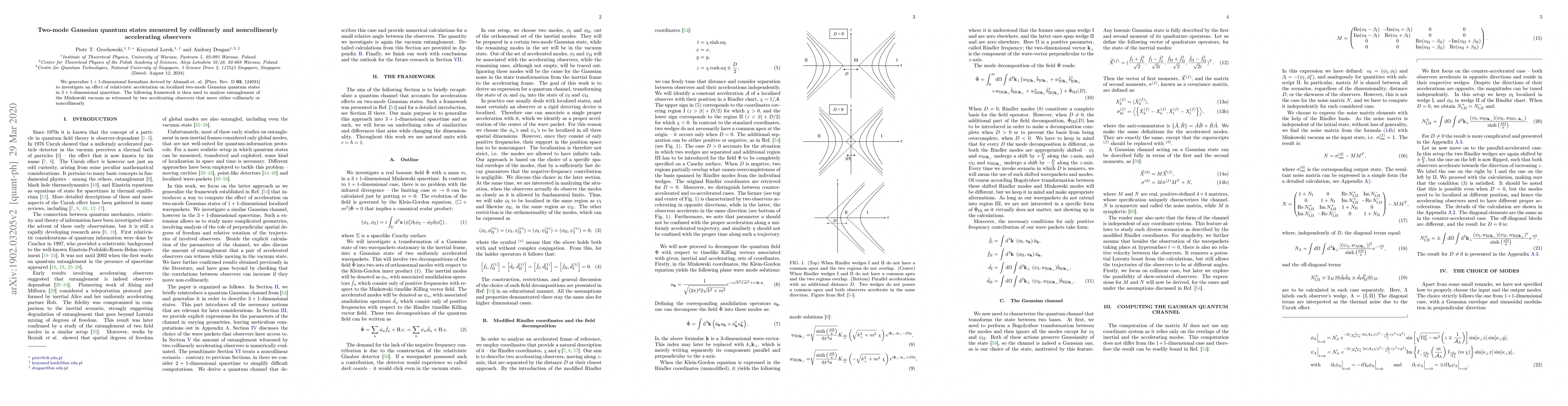 We generalize $1+1$-dimensional formalism derived by Ahmadi et. al. [Phys. Rev. D \textbf{93}, 124031] to investigate an effect of relativistic acceleration on localized two-mode Gaussian quantum states in $3+1$-dimensional spacetime. The following framework is then used to analyze entanglement of the Minkowski vacuum as witnessed by two accelerating observers that move either collinearly or noncollinearly.