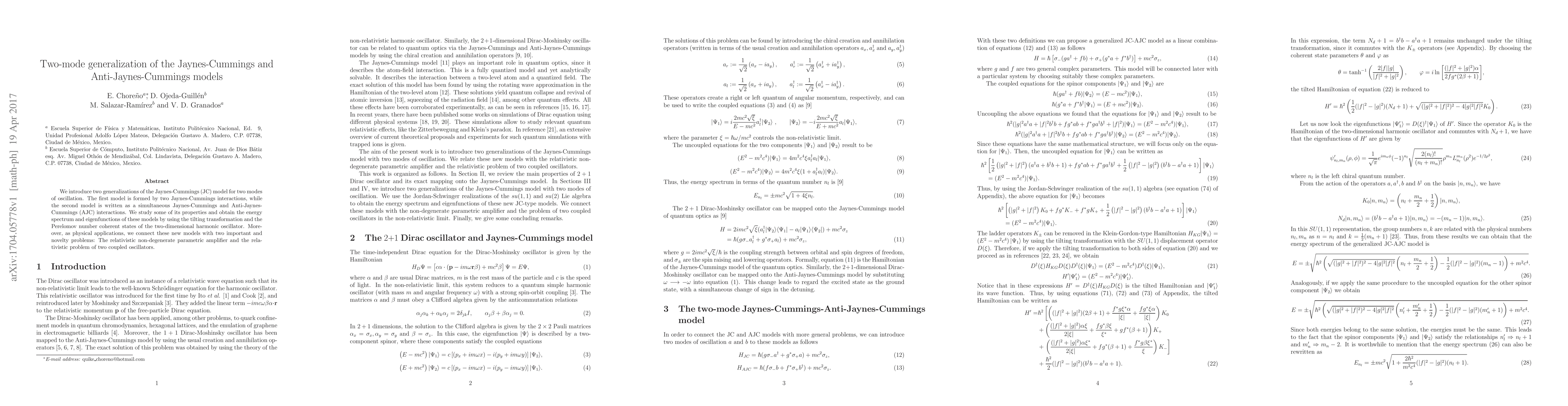 This paper generalizes the Jaynes-Cummings model to two modes, presenting two distinct models: one combining two Jaynes-Cummings interactions and another combining Jaynes-Cummings and Anti-Jaynes-Cummings interactions. The energy spectrum and eigenfunctions are derived using coherent states, with applications to relativistic parametric amplification and coupled oscillators.