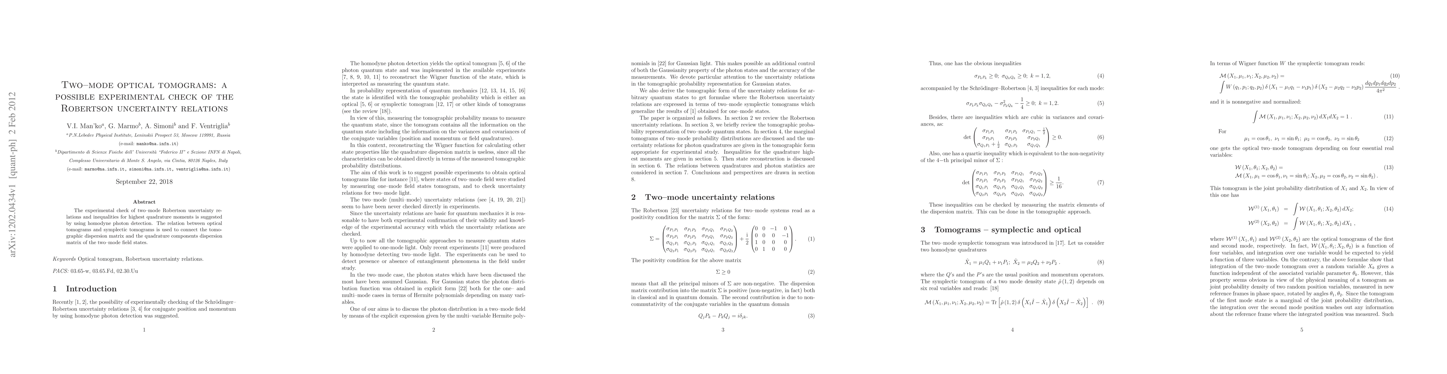 The experimental check of two--mode Robertson uncertainty relations and inequalities for highest quadrature moments is suggested by using homodyne photon detection. The relation between optical tomograms and symplectic tomograms is used to connect the tomographic dispersion matrix and the quadrature components dispersion matrix of the two--mode field states.
