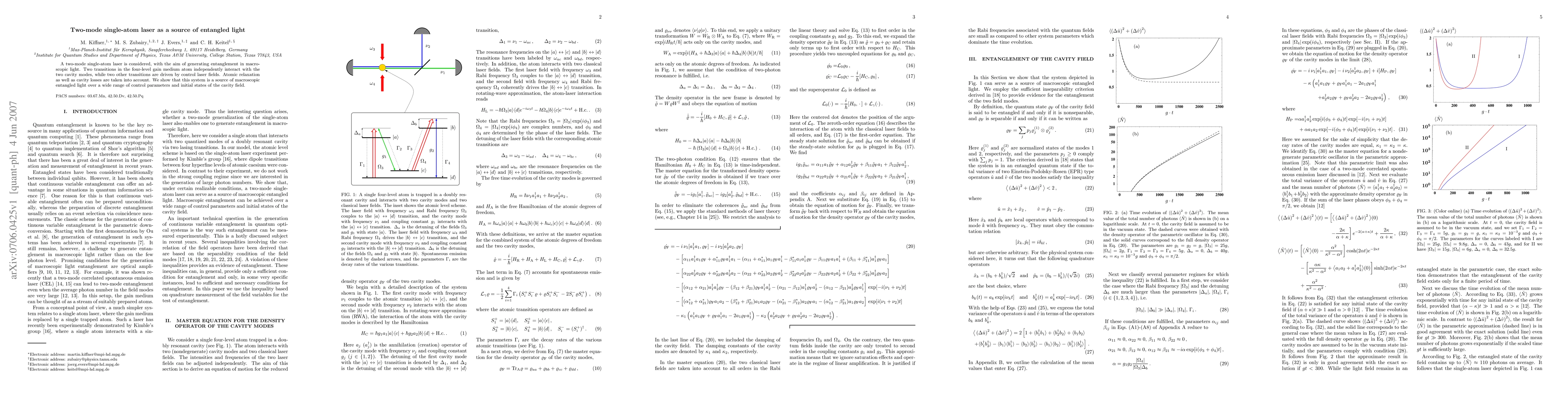 This research explores a two-mode single-atom laser designed to generate macroscopic entangled light through independent interactions of two transitions in a four-level atom with two cavity modes. The study demonstrates the system's capability to produce entangled light over various control parameters and initial cavity field states, accounting for atomic relaxation and cavity losses.