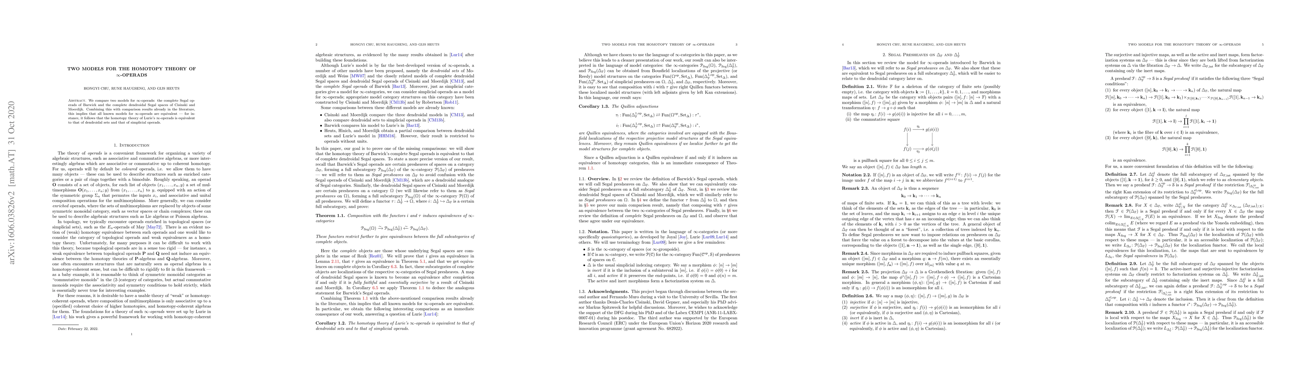 This paper compares two models for $\infty$-operads—complete Segal operads and complete dendroidal Segal spaces—showing their equivalence, thus unifying various known models for $\infty$-operads and establishing the equivalence of their respective homotopy theories.