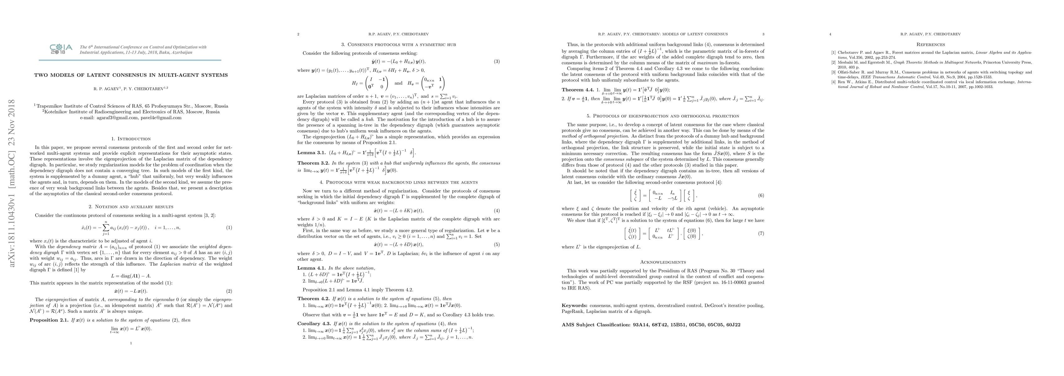 In this paper, we propose several consensus protocols of the first and second order for networked multi-agent systems and provide explicit representations for their asymptotic states. These representations involve the eigenprojection of the Laplacian matrix of the dependency digraph. In particular, we study regularization models for the problem of coordination when the dependency digraph does not contain a converging tree. In such models of the first kind, the system is supplemented by a dummy agent, a "hub" that uniformly, but very weakly influences the agents and, in turn, depends on them. In the models of the second kind, we assume the presence of very weak background links between the agents. Besides that, we present a description of the asymptotics of the classical second-order consensus protocol.