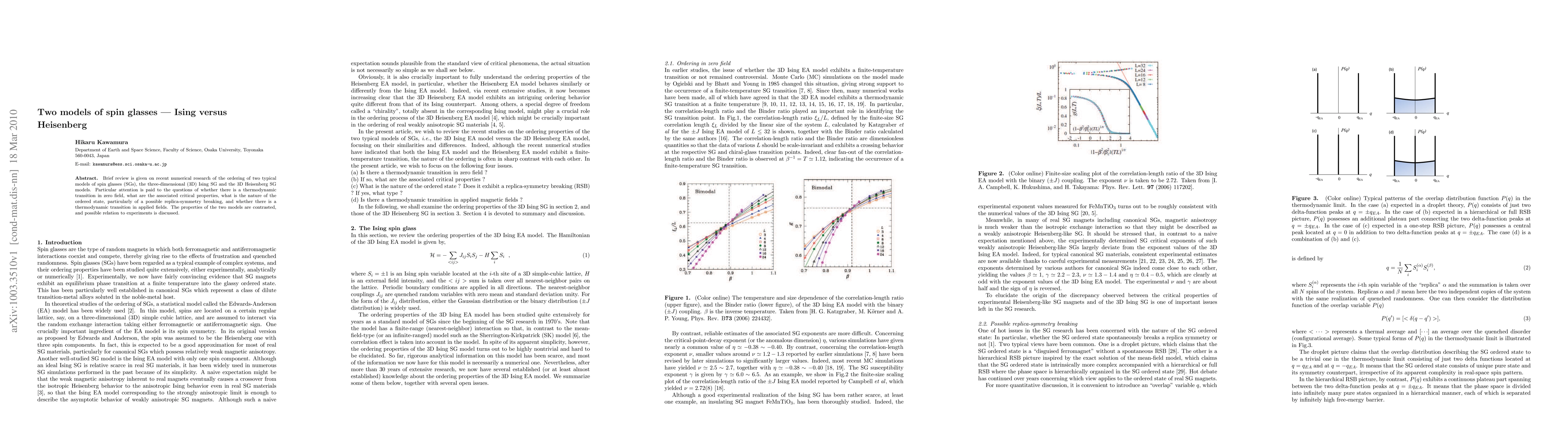 This paper reviews recent numerical studies comparing the 3D Ising and Heisenberg spin glass models, focusing on the presence and nature of thermodynamic transitions, critical properties, and the potential for replica-symmetry breaking, with implications for experimental observations.