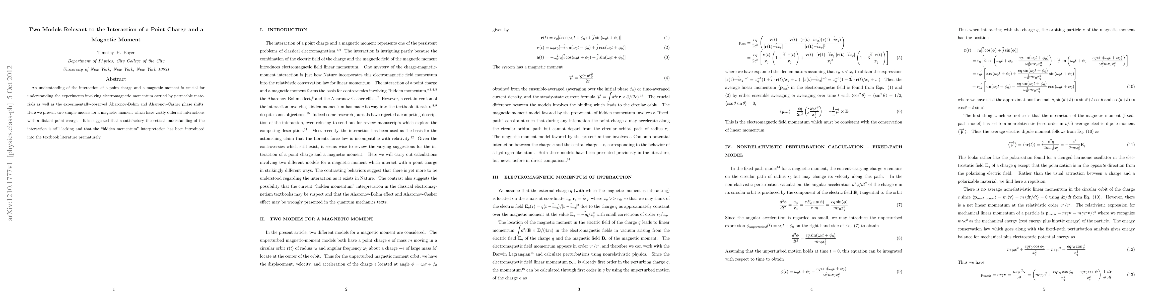 This paper explores two distinct models for a magnetic moment and their differing interactions with a distant point charge, highlighting the lack of a satisfactory theoretical understanding of these interactions, and critiques the premature introduction of the "hidden momentum" concept in textbooks.