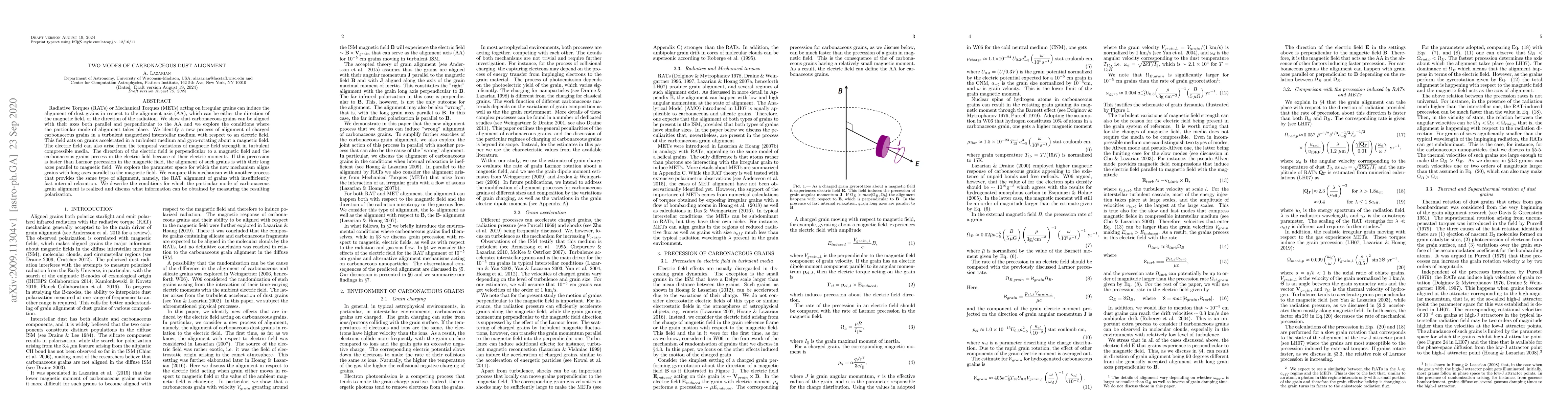 This paper explores two modes of alignment for carbonaceous dust grains: one via Radiative Torques (RATs) and another through a new mechanism involving electric fields in turbulent magnetized interstellar medium. The study identifies conditions under which grains align parallel to the magnetic field due to precession in an electric field.