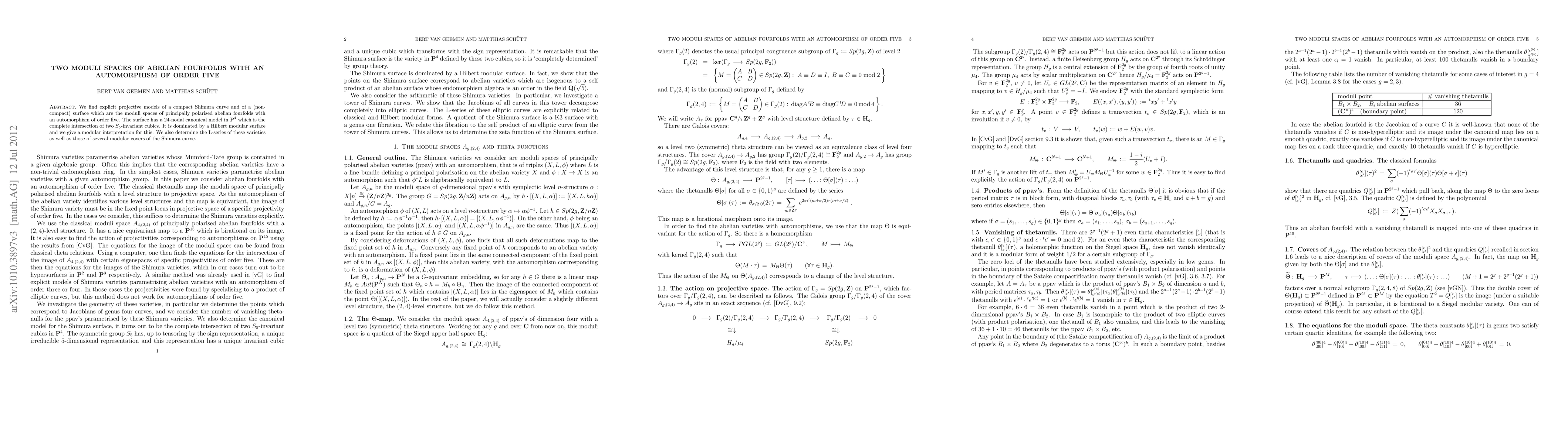 We find explicit projective models of a compact Shimura curve and of a (non-compact) surface which are the moduli spaces of principally polarised abelian fourfolds with an automorphism of order five. The surface has a 24-nodal canonical model in IP^4 which is the complete intersection of two S_5-invariant cubics. It is dominated by a Hilbert modular surface and we give a modular interpretation for this. We also determine the L-series of these varieties as well as those of several modular covers of the Shimura curve.