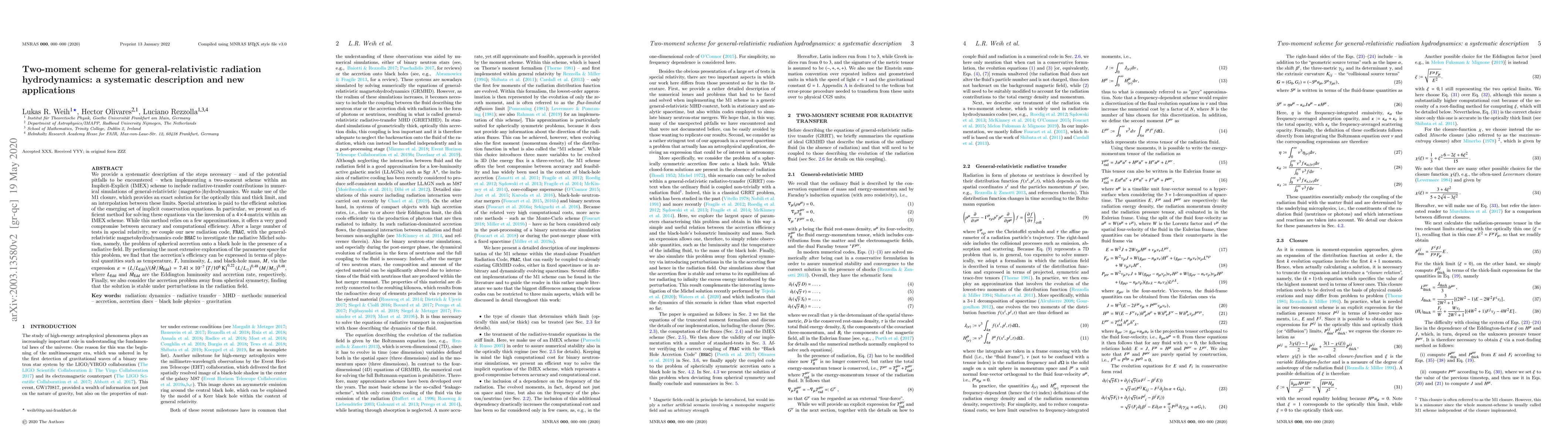 We provide a systematic description of the steps necessary -- and of the potential pitfalls to be encountered -- when implementing a two-moment scheme within an Implicit-Explicit (IMEX) scheme to include radiative-transfer contributions in numerical simulations of general-relativistic (magneto-)hydrodynamics. We make use of the M1 closure, which provides an exact solution for the optically thin and thick limit, and an interpolation between these limits. Special attention is paid to the efficient solution of the emerging set of implicit conservation equations. In particular, we present an efficient method for solving these equations via the inversion of a $4\times 4$-matrix within an IMEX scheme. While this method relies on a few approximations, it offers a very good compromise between accuracy and computational efficiency. After a large number of tests in special relativity, we couple our new radiation code, \texttt{FRAC}, with the general-relativistic magnetohydrodynamics code \texttt{BHAC} to investigate the radiative Michel solution, namely, the problem of spherical accretion onto a black hole in the presence of a radiative field. By performing the most extensive exploration of the parameter space for this problem, we find that the accretion's efficiency can be expressed in terms of physical quantities such as temperature, $T$, luminosity, $L$, and black-hole mass, $M$, via the expression $\varepsilon=(L/L_{\rm Edd})/(\dot{M}/\dot{M}_{\rm Edd})= 7.41\times 10^{-7}\left(T/10^6\,\mathrm{K}\right)^{0.22} \left(L/L_\odot\right)^{0.48} \left(M/M_\odot\right)^{0.48}$, where $L_{\mathrm{Edd}}$ and $\dot{M}_{\mathrm{Edd}}$ are the Eddington luminosity and accretion rate, respectively. Finally, we also consider the accretion problem away from spherical symmetry, finding that the solution is stable under perturbations in the radiation field.