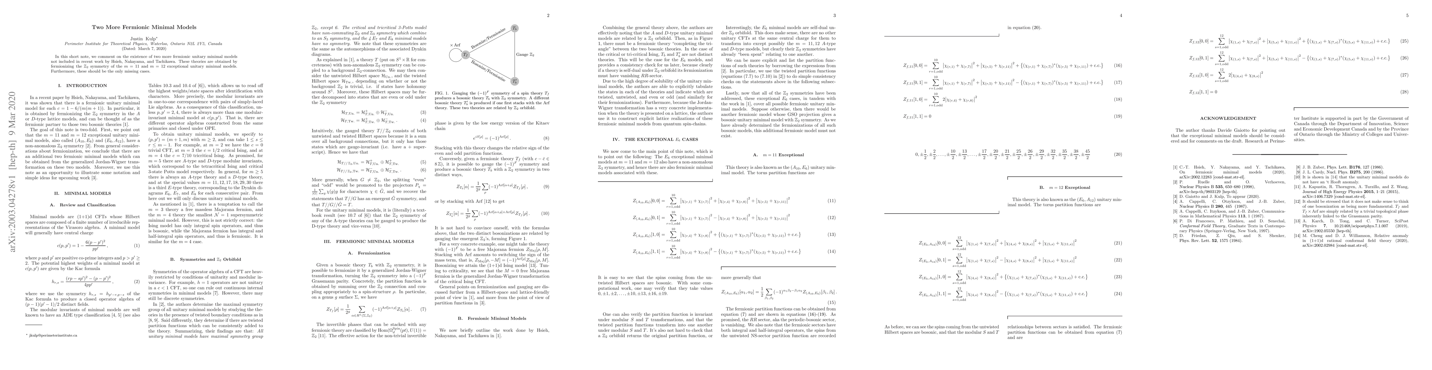 In this short note, we comment on the existence of two more fermionic unitary minimal models not included in recent work by Hsieh, Nakayama, and Tachikawa. These theories are obtained by fermionizing the $\mathbb{Z}_2$ symmetry of the m=11 and m=12 exceptional unitary minimal models. Furthermore, these should be the only missing cases.