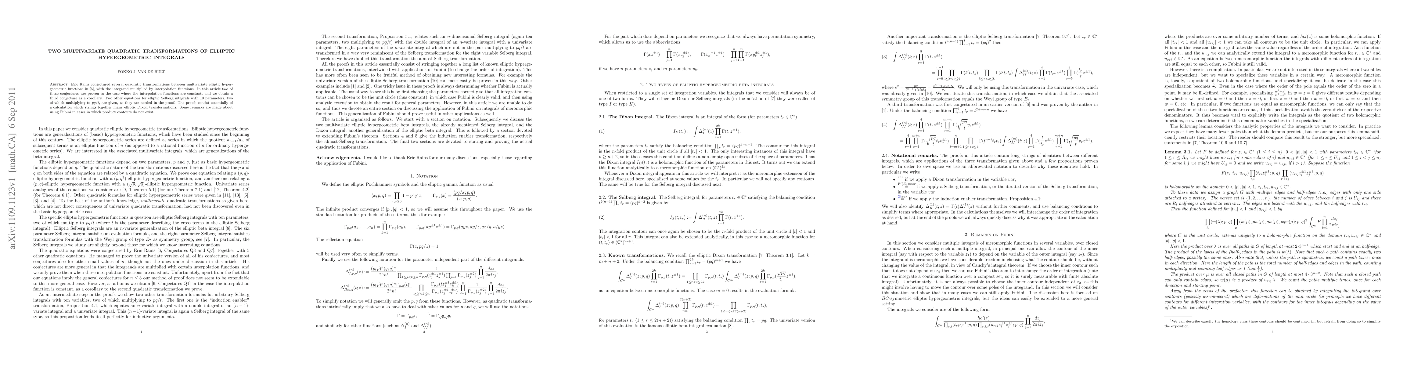 Eric Rains conjectured several quadratic transformations between multivariate elliptic hypergeometric functions in "Elliptic Littlewood Identities", with the integrand multiplied by interpolation functions. In this article two of these conjectures are proven in the case where the interpolation functions are constant, and we obtain a third conjecture as a corollary. Two other equations for elliptic Selberg integrals with 10 parameters, two of which multiplying to pq/t, are given, as they are needed in the proof. The proofs consist essentially of a calculation which strings together many elliptic Dixon transformations. Some remarks are made about using Fubini in cases in which product contours do not exist.