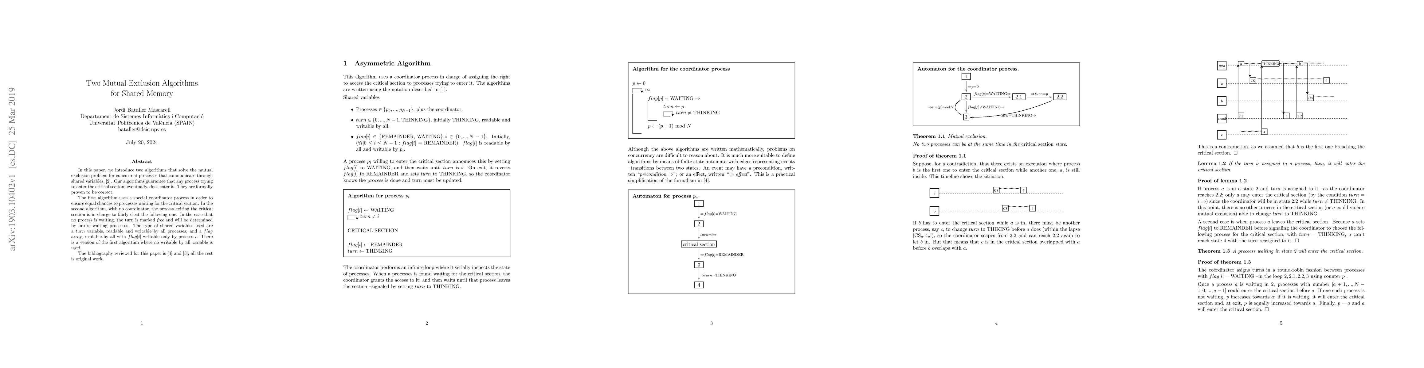 In this paper, we introduce two algorithms that solve the mutual exclusion problem for concurrent processes that communicate through shared variables, [2]. Our algorithms guarantee that any process trying to enter the critical section, eventually, does enter it. They are formally proven to be correct. The first algorithm uses a special coordinator process in order to ensure equal chances to processes waiting for the critical section. In the second algorithm, with no coordinator, the process exiting the critical section is in charge to fairly elect the following one. In the case that no process is waiting, the turn is marked free and will be determined by future waiting processes. The type of shared variables used are a turn variable, readable and writable by all processes; and a flag array, readable by all with flag[i] writable only by process i. There is a version of the first algorithm where no writable by all variable is used. The bibliography reviewed for this paper is [4] and [3], all the rest is original work.