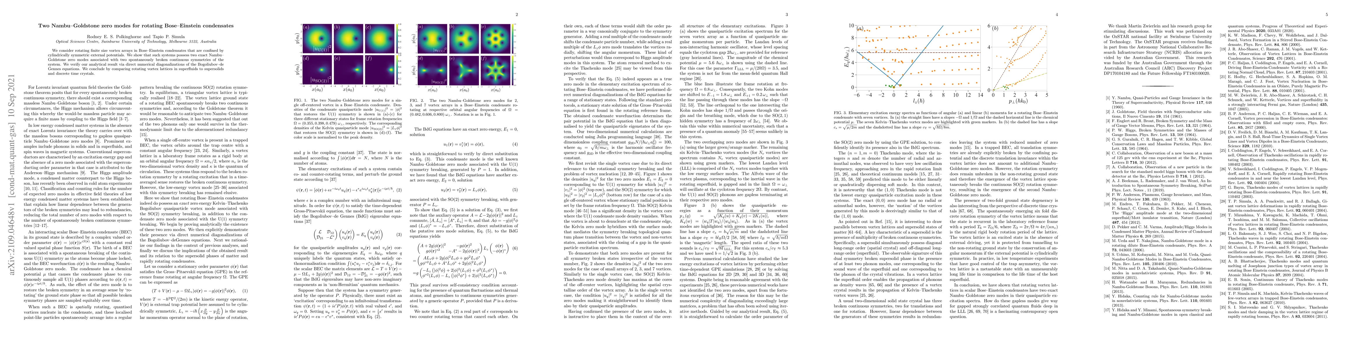 We consider rotating finite size vortex arrays in Bose-Einstein condensates that are confined by cylindrically symmetric external potentials. We show that such systems possess two exact Nambu-Goldstone zero modes associated with two spontaneously broken continuous symmetries of the system. We verify our analytical result via direct numerical diagonalizations of the Bogoliubov-de Gennes equations. We conclude by comparing rotating vortex lattices in superfluids to supersolids and discrete time crystals.