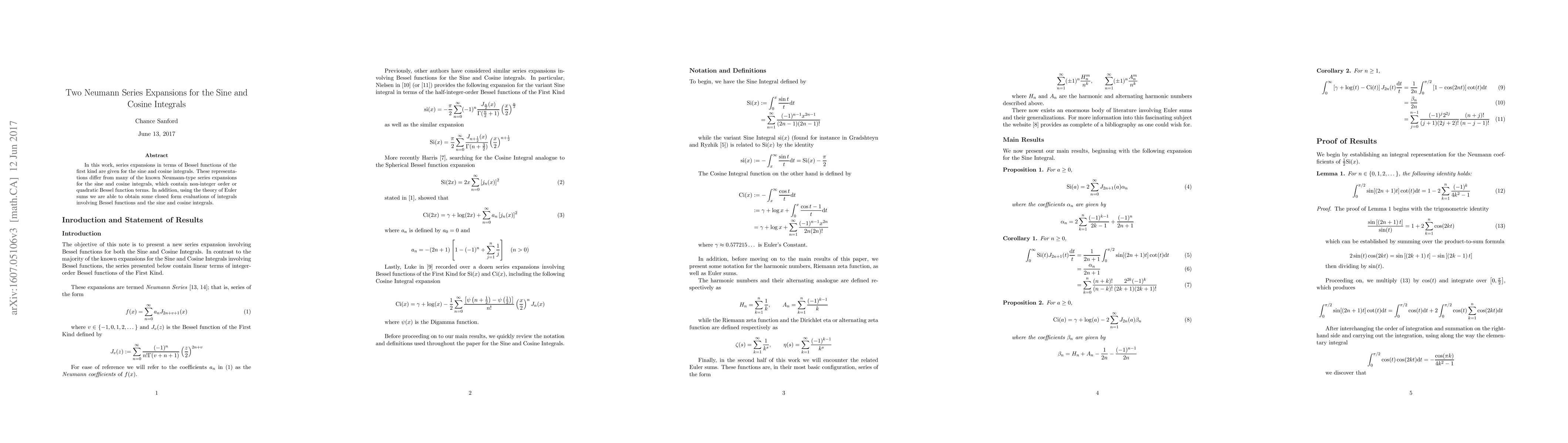 This paper presents novel series expansions for sine and cosine integrals using Bessel functions of the first kind, differing from traditional Neumann-type expansions by avoiding non-integer orders and quadratic terms. It also utilizes Euler sum theory to derive closed-form evaluations for integrals involving these functions.