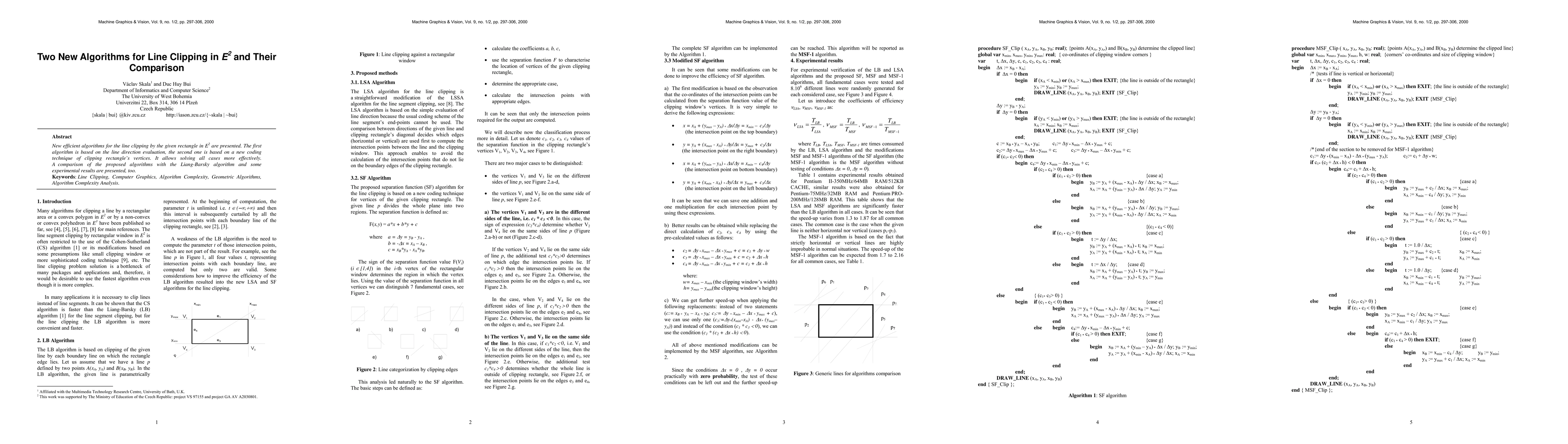 Two new algorithms for line clipping in E2 geometry are presented, offering faster solutions than existing methods despite increased complexity.