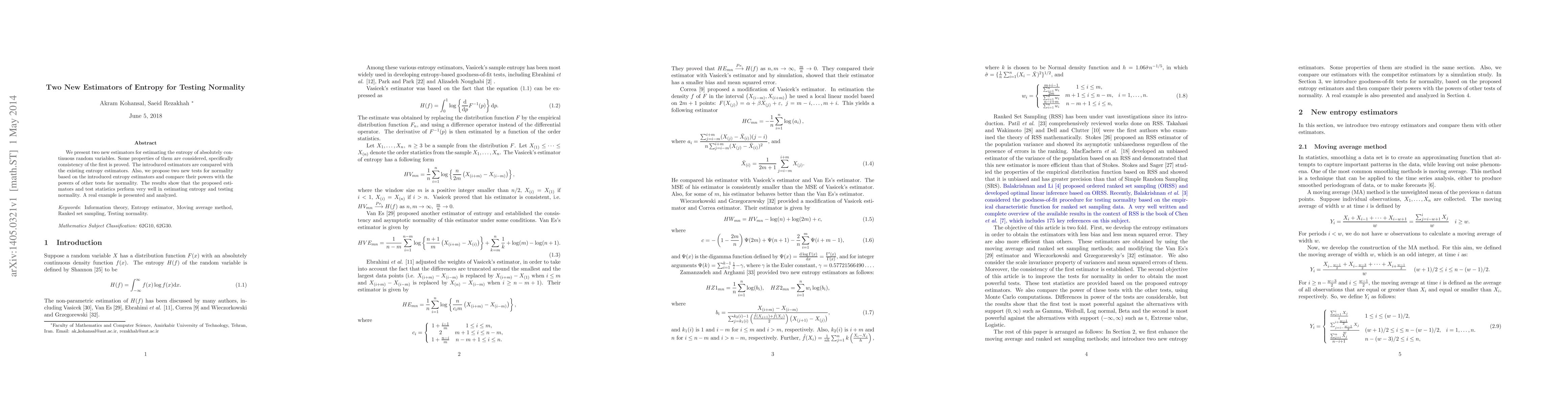 This paper introduces two new estimators for entropy of absolutely continuous random variables, proving consistency of the first. The estimators and corresponding tests for normality are compared favorably against existing methods, demonstrating superior performance in both entropy estimation and normality testing.