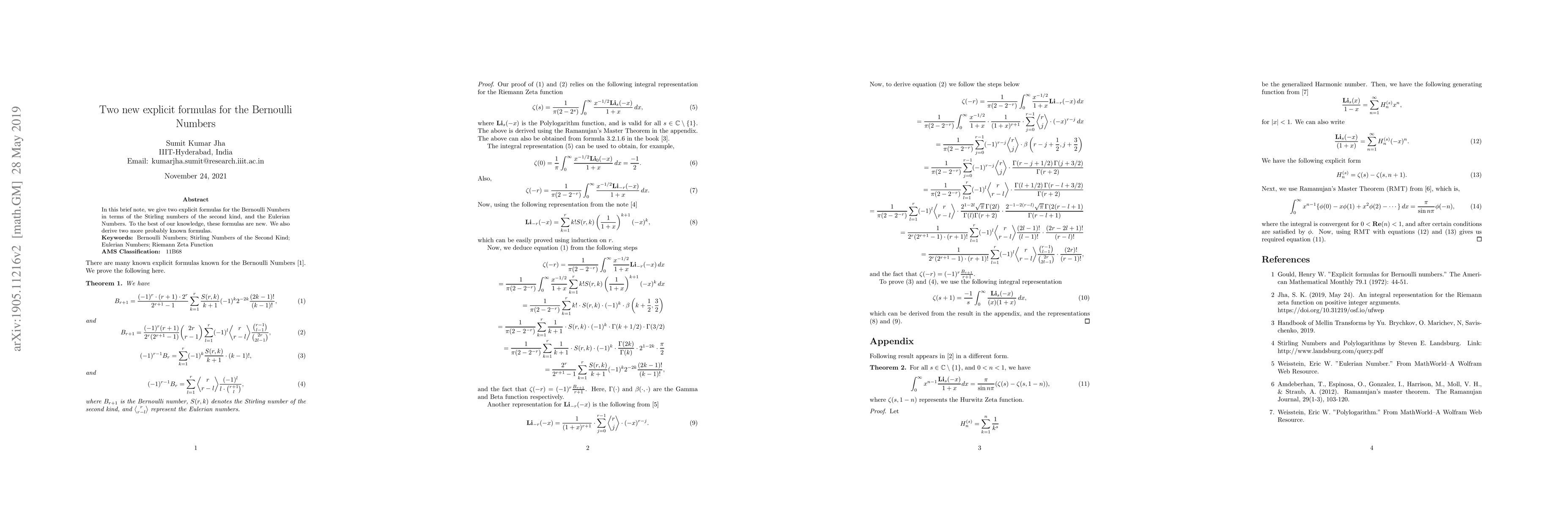 Summary: This paper introduces two novel explicit formulas for Bernoulli Numbers using Stirling numbers of the second kind and Eulerian Numbers. Additionally, it presents two more formulas, likely previously known, for Bernoulli Numbers.