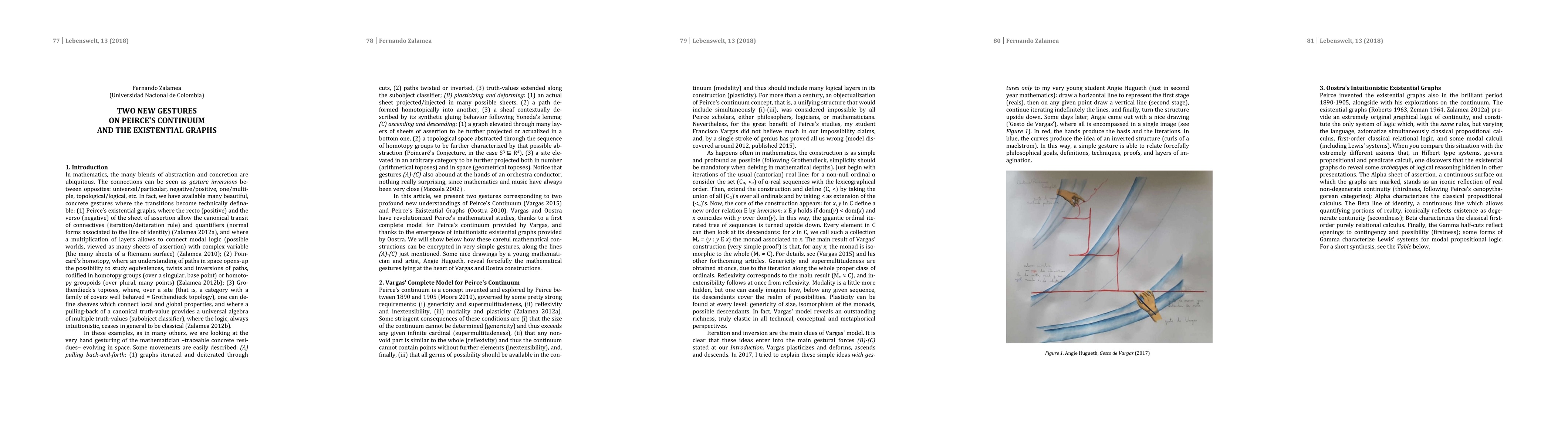 We present (1) a new model for Peirce's full continuum (Vargas 2012-2015), based on an iterated sheaf of real numbers over all ordinal numbers, (2) a new model for Peirce's existential graphs (Oostra 2010), based on a new geometrical symbol for intuitionistic implication, and (3) two new mathematical gestures that synthetically capture Vargas' and Oostra's constructions (Hugueth 2017).