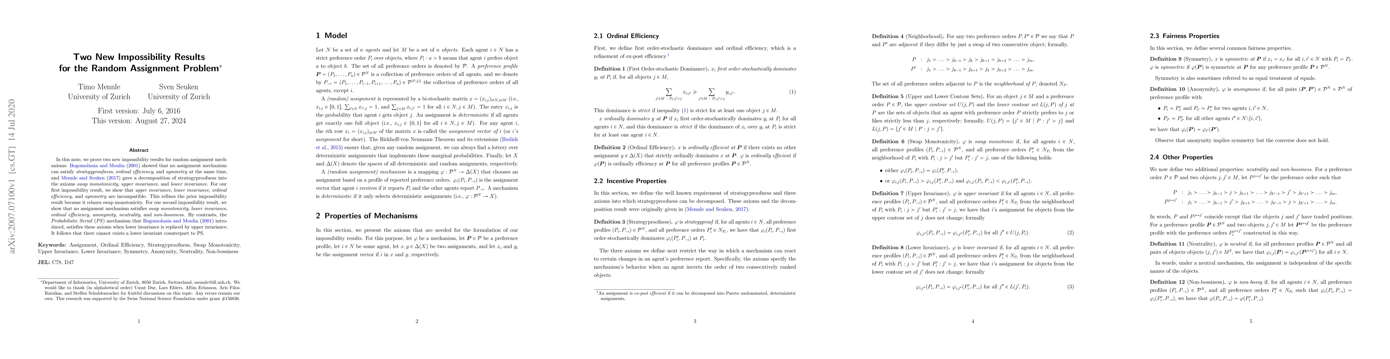 In this note, we prove two new impossibility results for random assignment mechanisms: Bogomolnaia and Moulin (2001) showed that no assignment mechanism can satisfy strategyproofness, ordinal efficiency, and symmetry at the same time, and Mennle and Seuken (2017) gave a decomposition of strategyproofness into the axioms swap monotonicity, upper invariance, and lower invariance. For our first impossibility result, we show that upper invariance, lower invariance, ordinal efficiency, and symmetry are incompatible. This refines the prior impossibility result because it relaxes swap monotonicity. For our second impossibility result, we show that no assignment mechanism satisfies swap monotonicity, lower invariance, ordinal efficiency, anonymity, neutrality, and non-bossiness. By contrasts, the Probabilistic Serial (PS) mechanism that Bogomolnaia and Moulin (2001) introduced, satisfies these axioms when lower invariance is replaced by upper invariance. It follows that there cannot exists a lower invariant counterpart to PS.