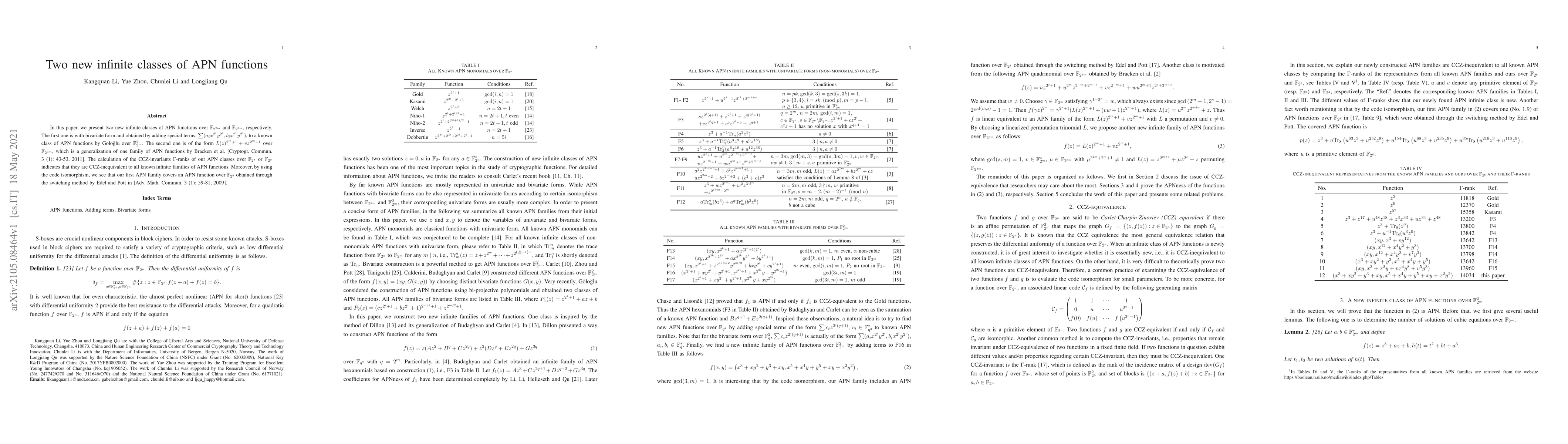 In this paper, we present two new infinite classes of APN functions over $\gf_{{2^{2m}}}$ and $\gf_{{2^{3m}}}$, respectively. The first one is with bivariate form and obtained by adding special terms, $\sum(a_ix^{2^i}y^{2^i},b_ix^{2^i}y^{2^i})$, to a known class of APN functions by {G{\"{o}}lo{\v{g}}lu} over $\gf_{{2^m}}^2$. The second one is of the form $L(z)^{2^m+1}+vz^{2^m+1}$ over $\gf_{{2^{3m}}}$, which is a generalization of one family of APN functions by Bracken et al. [Cryptogr. Commun. 3 (1): 43-53, 2011]. The calculation of the CCZ-invariants $\Gamma$-ranks of our APN classes over $\gf_{{2^8}}$ or $\gf_{{2^9}}$ indicates that they are CCZ-inequivalent to all known infinite families of APN functions. Moreover, by using the code isomorphism, we see that our first APN family covers an APN function over $\gf_{{2^8}}$ obtained through the switching method by Edel and Pott in [Adv. Math. Commun. 3 (1): 59-81, 2009].