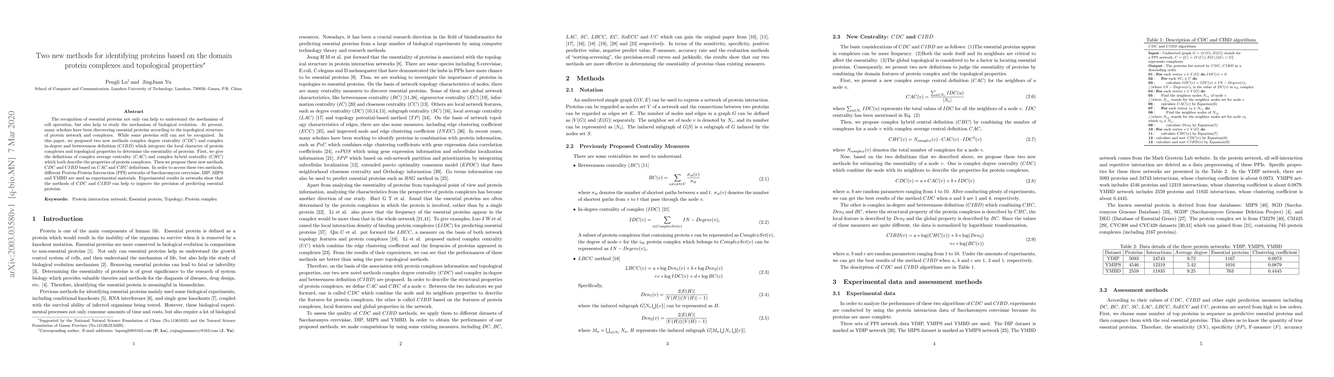 This paper introduces two new methods, complex degree centrality (CDC) and complex in-degree and betweenness definition (CIBD), to identify essential proteins by integrating protein complex characteristics and topological properties in protein networks. Experimental results on various PPI networks demonstrate improved precision in predicting essential proteins.