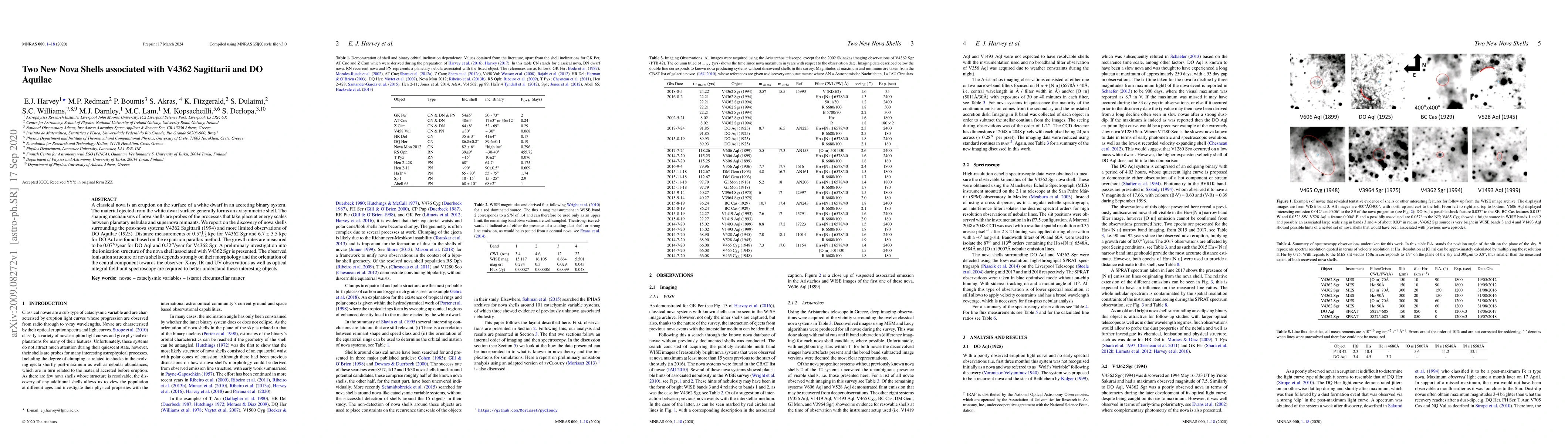 A classical nova is an eruption on the surface of a white dwarf in an accreting binary system. The material ejected from the white dwarf surface generally forms an axisymmetric shell. The shaping mechanisms of nova shells are probes of the processes that take place at energy scales between planetary nebulae and supernova remnants. We report on the discovery of nova shells surrounding the post-nova systems V4362 Sagittarii (1994) and more limited observations of DO Aquilae (1925). Distance measurements of 0.5p/m1.4 kpc for V4362 Sgr and 6.7 p/m 3.5 kpc -0.2 for DO Aql are found based on the expansion parallax method. The growth rates are measured to be 0.07``/year for DO Aql and 0.32``/year for V4362 Sgr. A preliminary investigation into the ionisation structure of the nova shell associated with V4362 Sgr is presented. The observed ionisation structure of nova shells depends strongly on their morphology and the orientation of the central component towards the observer. X-ray, IR and UV observations as well as optical integral field unit spectroscopy are required to better understand these interesting objects.