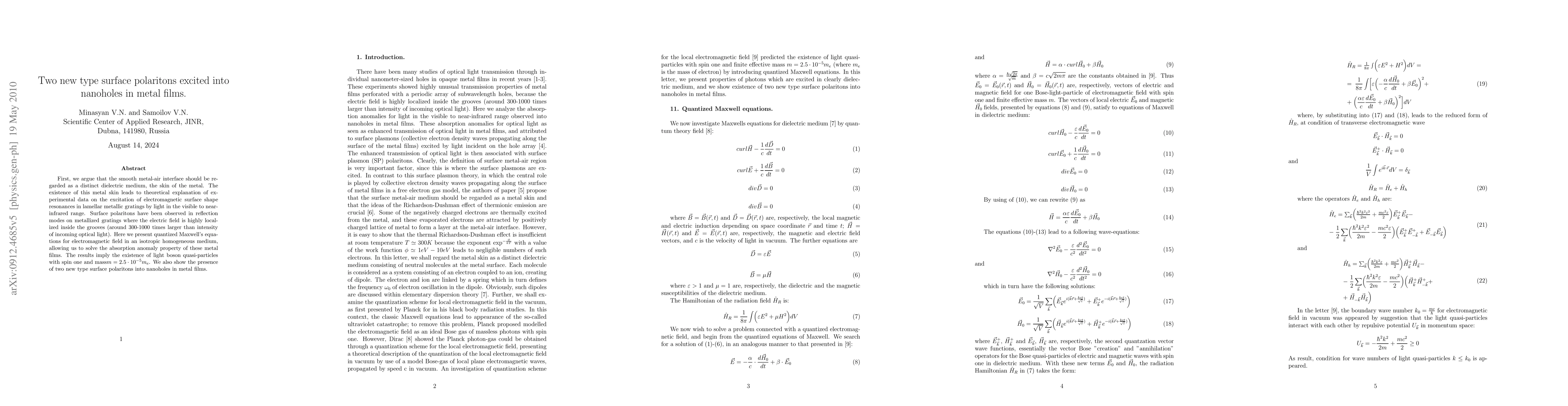 First, we argue that the smooth metal-air interface should be regarded as a distinct dielectric medium, the skin of the metal. The existence of this metal skin leads to theoretical explanation of experimental data on the excitation of electromagnetic surface shape resonances in lamellar metallic gratings by light in the visible to near-infrared range. Surface polaritons have been observed in reflection modes on metallized gratings where the electric field is highly localized inside the grooves (around 300-1000 times larger than intensity of incoming optical light). Here we present quantized Maxwell's equations for electromagnetic field in an isotropic homogeneous medium, allowing us to solve the absorption anomaly property of these metal films. The results imply the existence of light boson particles with spin one and effective mass $m= 2.5\cdot 10^{-5} m_e$. We also show the presence of two new type surface polaritons into nanoholes in metal films.