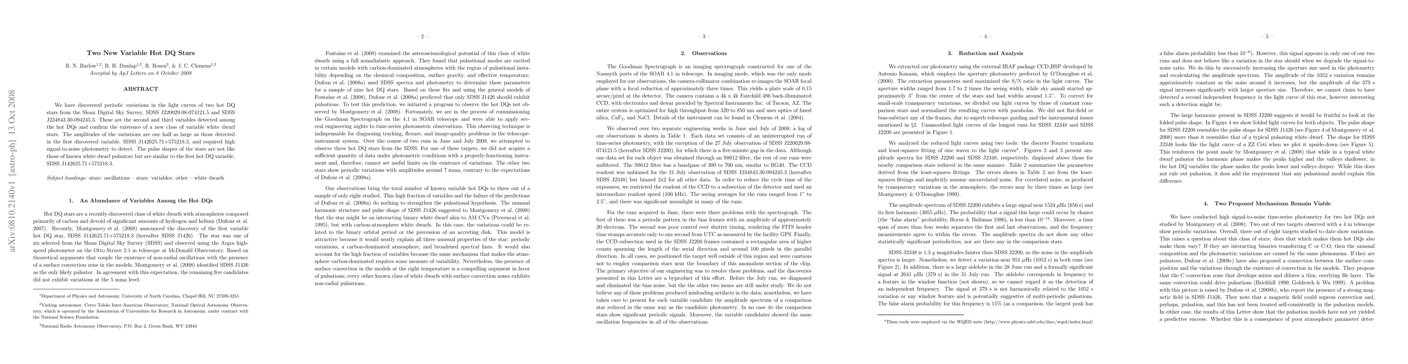 This paper reports the discovery of periodic light variations in two new hot DQ stars, SDSS J220029.08-074121.5 and SDSS J234843.30-094245.3, confirming a new class of variable white dwarf stars with unique pulse shapes. These variations are half the amplitude of the first detected variable and required high-quality photometry for detection.
