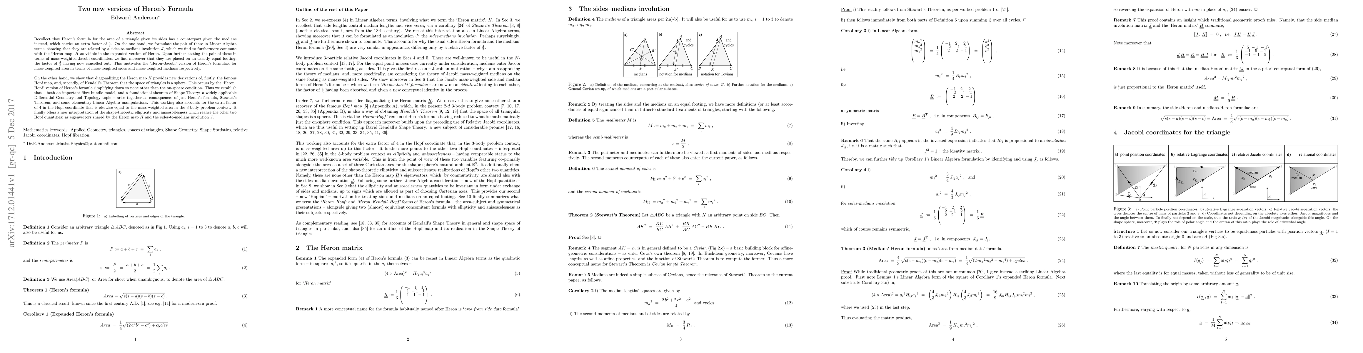 This paper presents two new versions of Heron's formula: one in terms of mass-weighted sides and medians, and another that connects Heron's formula to the Hopf map and Kendall's Theorem, revealing deep geometric and topological insights.