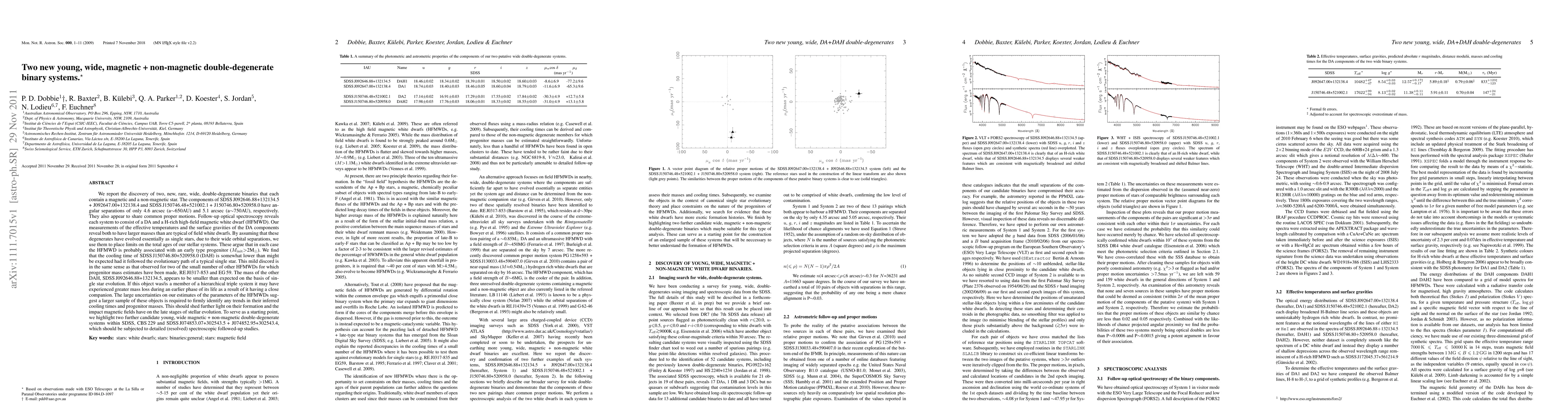 Abridged: We report the discovery of two, new, rare, wide, double-degenerate binaries that each contain a magnetic and a non-magnetic star. The components of SDSSJ092646.88+132134.5 + J092647.00+132138.4 and SDSSJ150746.48+521002.1 + J150746.80+520958.0 have angular separations of only 4.6 arcsec (a~650AU) and 5.1 arcsec (a~750AU), respectively. They also appear to share common proper motions. Follow-up optical spectroscopy reveals each system to consist of a DA and a H-rich high-field magnetic white dwarf (HFMWD). Our measurements of the effective temperatures and the surface gravities of the DA components reveal both to have larger masses than are typical of field white dwarfs. By assuming that these degenerates have evolved essentially as single stars, due to their wide orbital separations, we use them to place limits on the total ages of our stellar systems. These argue that in each case the HFMWD is probably associated with an early type progenitor (M_init > 2M_solar). We find that the cooling time of SDSSJ150746.80+520958.0 (DAH) is somewhat lower than might be expected had it followed the evolutionary path of a typical single star. This mild discord is in the same sense as that observed for two of the small number of other HFMWDs for which progenitor mass estimates have been made, REJ0317-853 and EG59. The mass of the other DAH, SDSSJ092646.88+132134.5, appears to be smaller than expected on the basis of single star evolution. If this object was/is a member of a hierarchical triple system it may have experienced greater mass loss during an earlier phase of its life as a result of it having a close companion. The large uncertainties on our estimates of the parameters of the HFMWDs suggest a larger sample of these objects is required to firmly identify any trends in their inferred cooling times and progenitor masses.