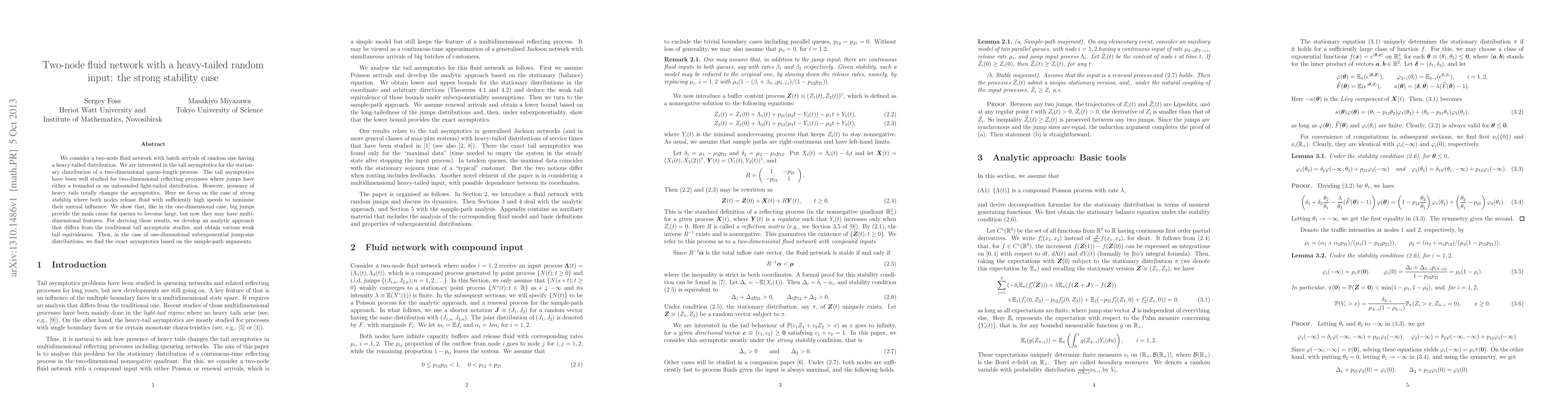 We consider a two-node fluid network with batch arrivals of random size having a heavy-tailed distribution. We are interested in the tail asymptotics for the stationary distribution of a two-dimensional queue-length process. The tail asymptotics have been well studied for two-dimensional reflecting processes where jumps have either a bounded or an unbounded light-tailed distribution. However, presence of heavy tails totally changes the asymptotics. Here we focus on the case of strong stability where both nodes release fluid with sufficiently high speeds to minimise their mutual influence. We show that, like in the one-dimensional case, big jumps provide the main cause for queues to become large, but now they may have multi-dimensional features. For deriving these results, we develop an analytic approach that differs from the traditional tail asymptotic studies, and obtain various weak tail equivalences. Then, in the case of one-dimensional subexponential jump-size distributions, we find the exact asymptotics based on the sample-path arguments.