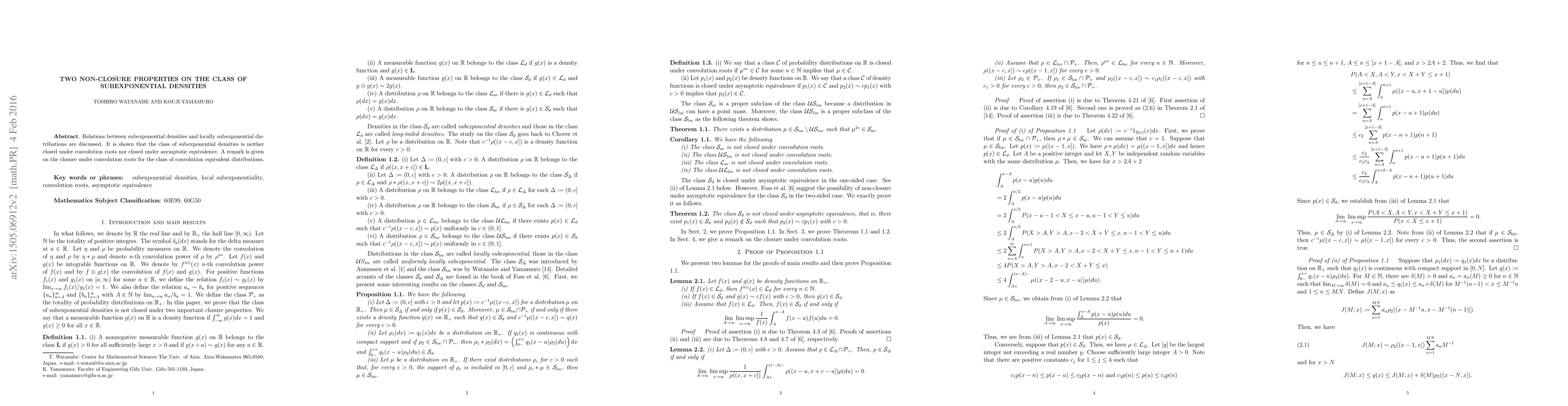 Subexponential densities do not form closed classes under convolution roots or asymptotic equivalence, with implications for understanding their properties and behavior in probability theory.