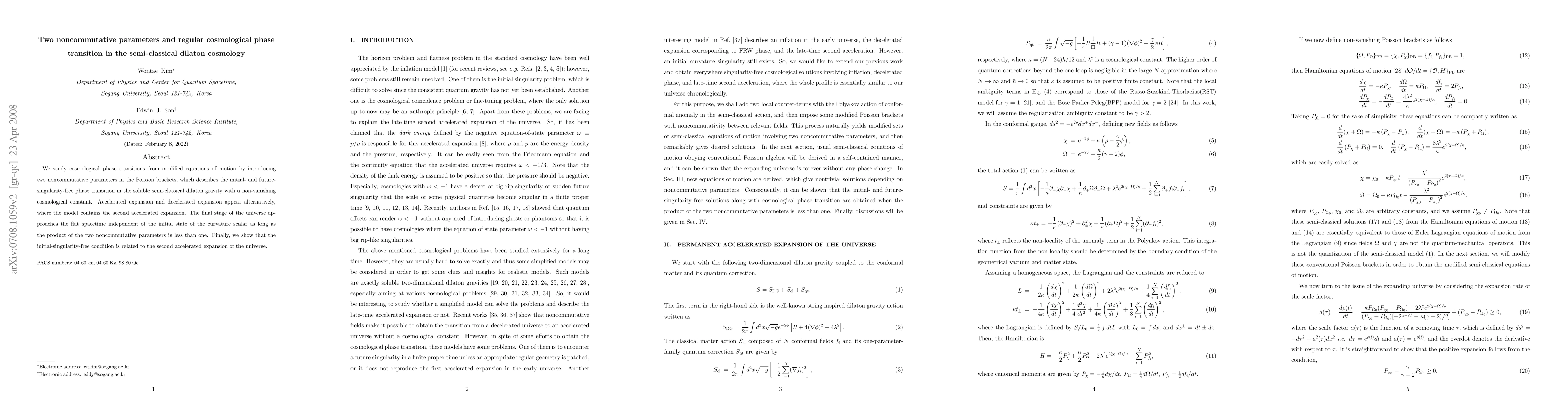We study cosmological phase transitions from modified equations of motion by introducing two non-commutative parameters in the Poisson brackets, which describes the initial- and future-singularity-free phase transition in the soluble semi-classical dilaton gravity with a non-vanishing cosmological constant. Accelerated expansion and decelerated expansion corresponding to the FRW phase appear alternatively, and then it ends up with the second accelerated expansion. The final stage of the universe approaches the flat spacetime independent of the initial state of the curvature scalar as long as the product of the two non-commutative parameters is less than one. Finally, we show that the initial-singularity-free condition is related to the second accelerated expansion of the universe.