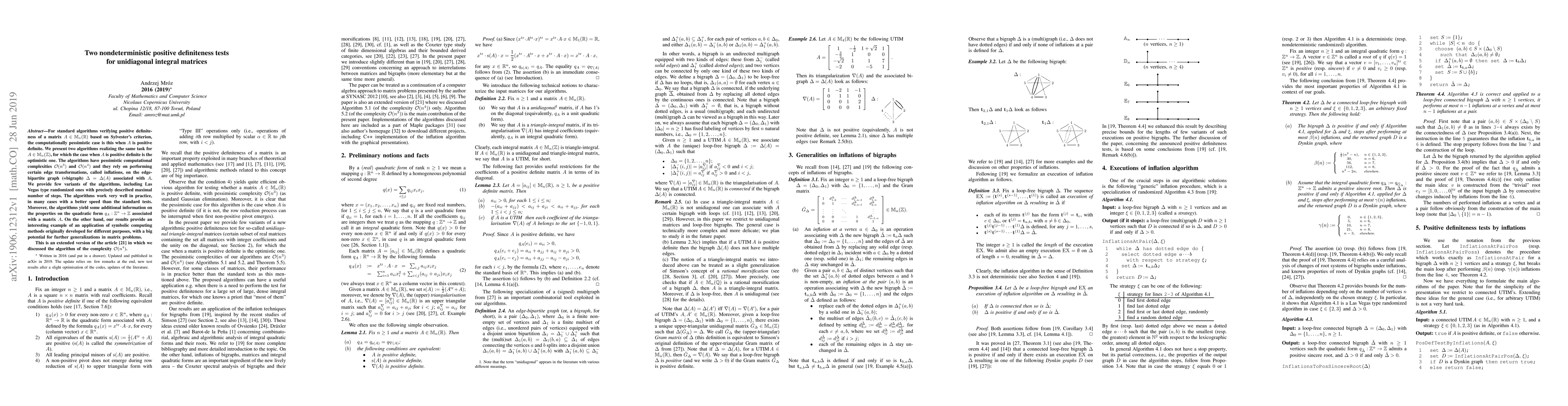 For standard algorithms verifying positive definiteness of a matrix $A\in\mathbb{M}_n(\mathbb{R})$ based on Sylvester's criterion, the computationally pessimistic case is this when $A$ is positive definite. We present two algorithms realizing the same task for $A\in\mathbb{M}_n(\mathbb{Z})$, for which the case when $A$ is positive definite is the optimistic one. The algorithms have pessimistic computational complexities $\mathcal{O}(n^3)$ and $\mathcal{O}(n^4)$ and they rely on performing certain edge transformations, called inflations, on the edge-bipartite graph (=bigraph) $\Delta=\Delta(A)$ associated with $A$. We provide few variants of the algorithms, including Las Vegas type randomized ones with precisely described maximal number of steps. The algorithms work very well in practice, in many cases with a better speed than the standard tests. Moreover, the algorithms yield some additional information on the properties on the quadratic form $q_A:\mathbb{Z}^n\to\mathbb{Z}$ associated with a matrix $A$. On the other hand, our results provide an interesting example of an application of symbolic computing methods originally developed for different purposes, with a big potential for further generalizations in matrix problems. This is an extended version of the article [A. Mr\'oz, Effective nondeterministic positive definiteness test for unidiagonal integral matrices, Proceedings SYNASC 2016, IEEE Computer Society CPS (2016), 65-71] in which we discussed the algorithm of the complexity $\mathcal{O}(n^4)$.