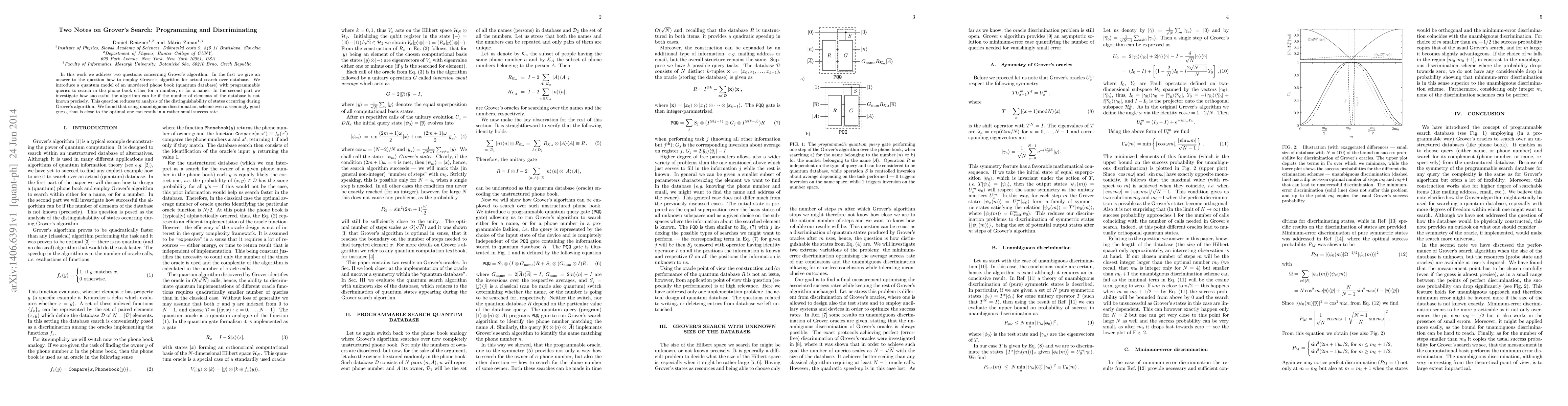 In this work we address two questions concerning Grover's algorithm. In the first we give an answer to the question how to employ Grover's algorithm for actual search over database. We introduce a quantum model of an unordered phone book (quantum database) with programmable queries to search in the phone book either for a number, or for a name. In the second part we investigate how successful the algorithm can be if the number of elements of the database is not known precisely. This question reduces to analysis of the distinguishability of states occurring during Grover's algorithm. We found that using unambiguous discrimination scheme even a seemingly good guess, that is close to the optimal one can result in a rather small success rate.