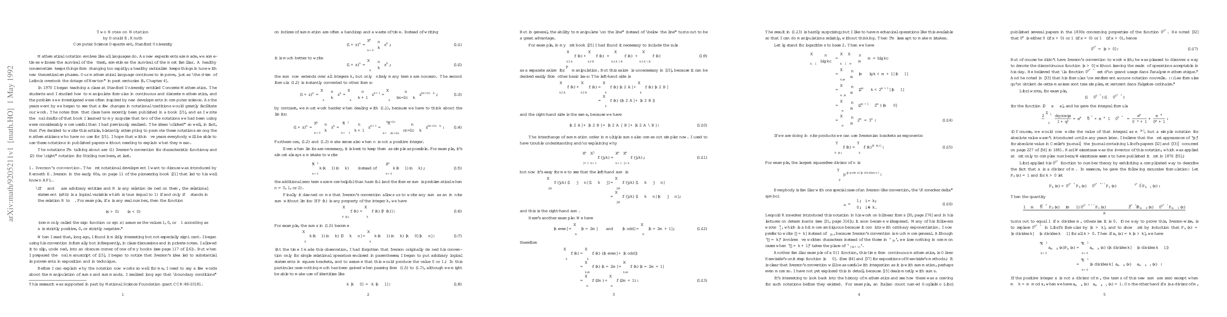 The author advocates two specific mathematical notations from his popular course and joint textbook, "Concrete Mathematics". The first of these, extending an idea of Iverson, is the notation "[P]" for the function which is 1 when the Boolean condition P is true and 0 otherwise. This notation can encourage and clarify the use of characteristic functions and Kronecker deltas in sums and integrals. The second notation puts Stirling numbers on the same footing as binomial coefficients. Since binomial coefficients are written on two lines in parentheses and read "n choose k", Stirling numbers of the first kind should be written on two lines in brackets and read "n cycle k", while Stirling numbers of the second kind should be written in braces and read "n subset k". (I might say "n partition k".) The written form was first suggested by Imanuel Marx. The virtues of this notation are that Stirling partition numbers frequently appear in combinatorics, and that it more clearly presents functional relations similar to those satisfied by binomial coefficients.