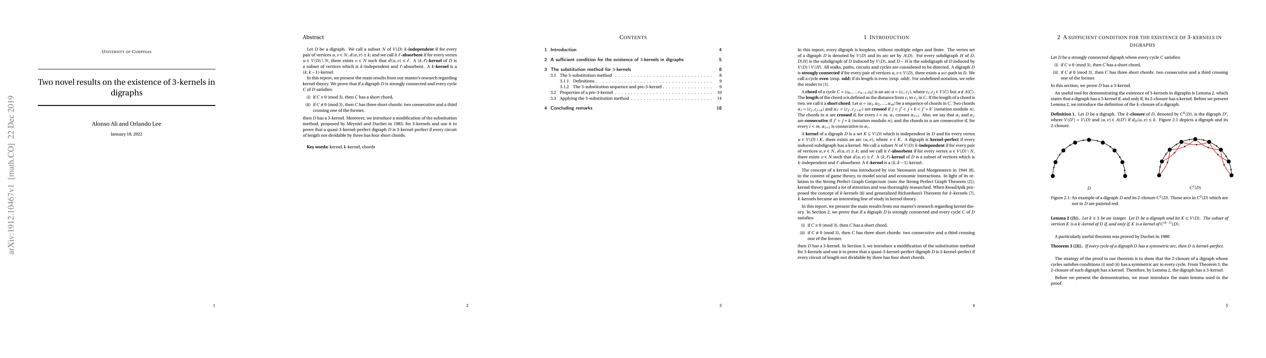 Let $D$ be a digraph. We call a subset $N$ of $V(D)$ $k$-independent if for every pair of vertices $u,v \in N$, $d(u,v) \geq k$; and we call it $\ell$-absorbent if for every vertex $u \in V(D) \setminus N$, there exists $v \in N$ such that $d(u,v) \leq \ell$. A $(k,\ell)$-kernel of $D$ is a subset of vertices which is $k$-independent and $\ell$-absorbent. A $k$-kernel is a $(k,k-1)$-kernel. In this report, we present the main results from our master's research regarding kernel theory. We prove that if a digraph $D$ is strongly connected and every cycle $C$ of $D$ satisfies: $(i)$ if $C \equiv 0 \pmod 3$, then $C$ has a short chord and $(ii)$ if $C \not \equiv 0 \pmod 3$, then $C$ has three short chords: two consecutive and a third crossing one of the former, then $D$ has a $3$-kernel. Moreover, we introduce a modification of the substitution method, proposed by Meyniel and Duchet in 1983, for $3$-kernels and use it to prove that a quasi-$3$-kernel-perfect digraph $D$ is $3$-kernel-perfect if every circuit of length not dividable by three has four short chords.