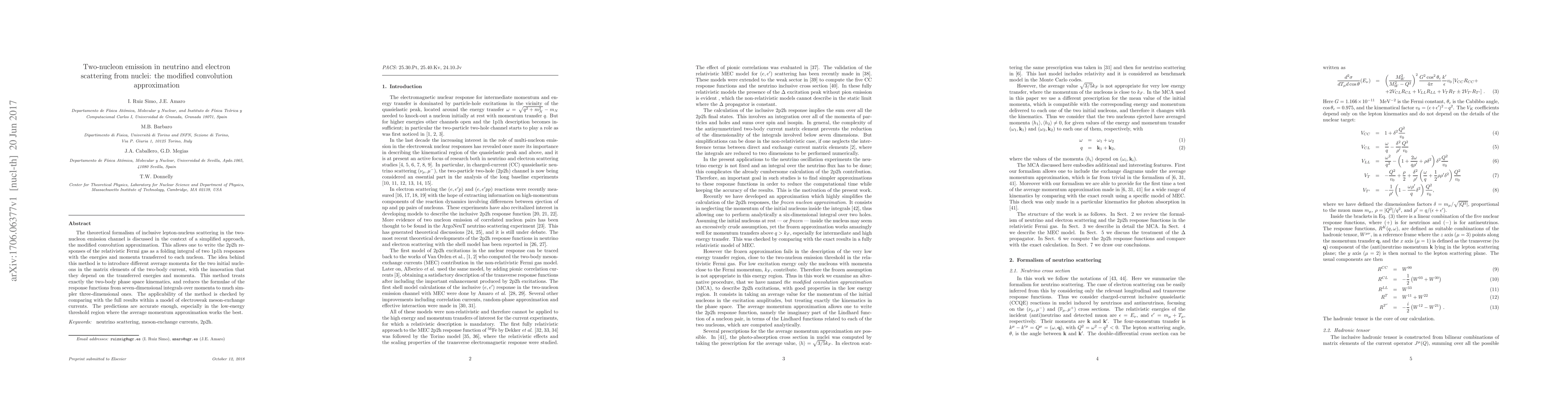The theoretical formalism of inclusive lepton-nucleus scattering in the two-nucleon emission channel is discussed in the context of a simplified approach, the modified convolution approximation. This allows one to write the 2p2h responses of the relativistic Fermi gas as a folding integral of two 1p1h responses with the energies and momenta transferred to each nucleon. The idea behind this method is to introduce different average momenta for the two initial nucleons in the matrix elements of the two-body current, with the innovation that they depend on the transferred energies and momenta. This method treats exactly the two-body phase space kinematics, and reduces the formulae of the response functions from seven-dimensional integrals over momenta to much simpler three-dimensional ones. The applicability of the method is checked by comparing with the full results within a model of electroweak meson-exchange currents. The predictions are accurate enough, especially in the low-energy threshold region where the average momentum approximation works the best.
