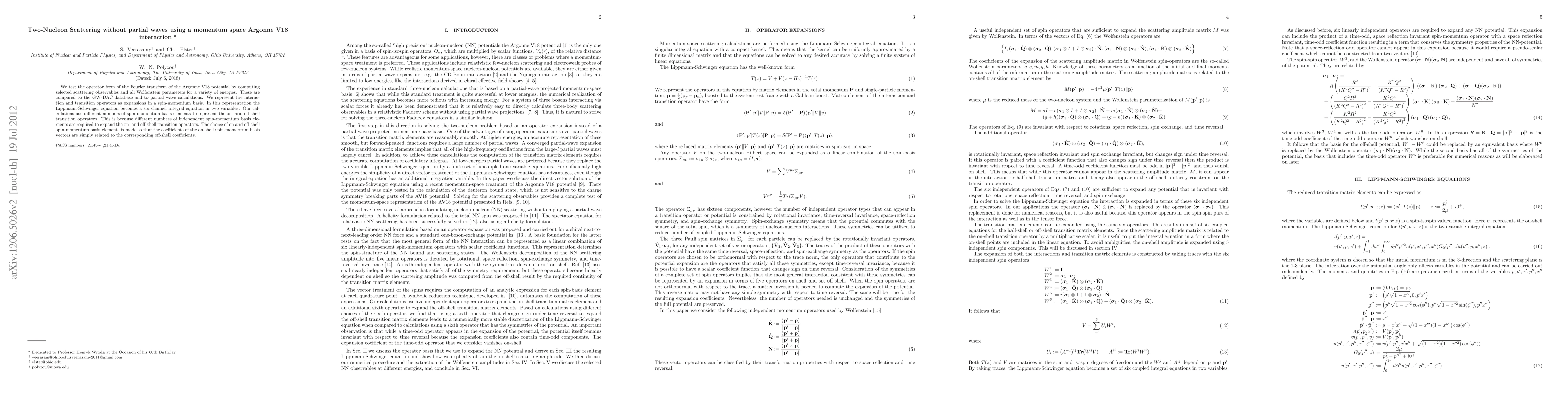 We test the operator form of the Fourier transform of the Argonne V18 potential by computing selected scattering observables and all Wolfenstein parameters for a variety of energies. These are compared to the GW-DAC database and to partial wave calculations. We represent the interaction and transition operators as expansions in a spin-momentum basis. In this representation the Lippmann-Schwinger equation becomes a six channel integral equation in two variables. Our calculations use different numbers of spin-momentum basis elements to represent the on- and off-shell transition operators. This is because different numbers of independent spin-momentum basis elements are required to expand the on- and off-shell transition operators. The choice of on and off-shell spin-momentum basis elements is made so that the coefficients of the on-shell spin-momentum basis vectors are simply related to the corresponding off-shell coefficients.