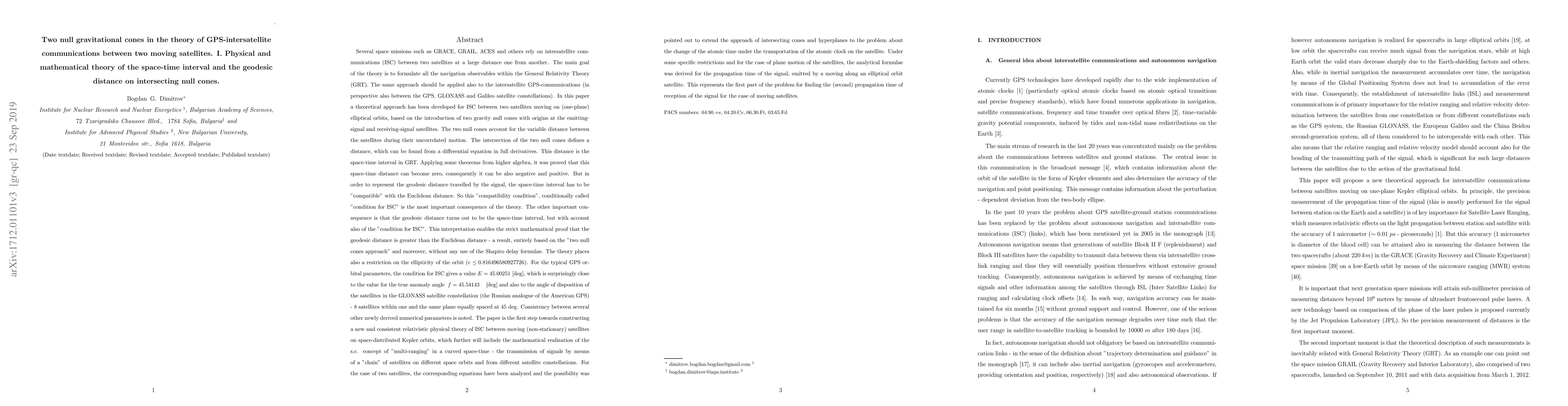 Several space missions such as GRACE, GRAIL, ACES and others rely on intersatellite communications (ISC) between two satellites at a large distance one from another. The main goal of the theory is to formulate all the navigation observables within the General Relativity Theory. The same approach should be applied also to the intersatellite GPS-communications (in perspective also between the GPS, GLONASS and Galileo satellite constellations). In this paper a theoretical approach has been developed for ISC between two satellites moving on (one-plane) elliptical orbits, based on the introduction of two gravity null cones with origins at the emitting-signal and receiving-signal satellites. The two null cones account for the variable distance between the satellites during their uncorrelated motion.The intersection of the two null cones defines a distance, which can be found from a differential equation in full derivatives. This distance is the space-time interval in GRT. Applying some theorems from higher algebra, it was proved that this space-time distance can become zero, consequently it can be also negative and positive. But in order to represent the geodesic distance travelled by the signal, the space-time interval has to be "compatible" with the Euclidean distance. So this "compatibility condition", conditionally called "condition for ISC", is the most important consequence of the theory. The other important consequence is that the geodesic distance turns out to be the space-time interval, but with account also of the "condition for ISC". This interpretation enables the strict mathematical proof that the geodesic distance is greater than the Euclidean distance - a result, entirely based on the "two null cones approach" and moreover, without any use of the Shapiro delay formulae. Consistency between several other newly derived numerical parameters is noted.