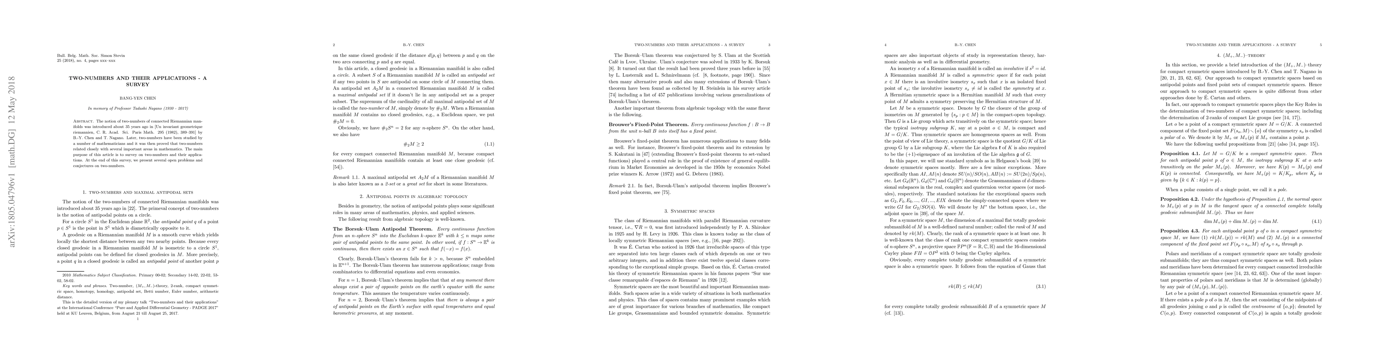 The notion of two-numbers of connected Riemannian manifolds was introduced about 35 years ago in [Un invariant geometrique riemannien, C. R. Acad. Sci. Paris Math. 295 (1982), 389--391] by B.-Y. Chen and T. Nagano. Later, two-numbers have been studied by a number of mathematicians and it was then proved that two-numbers related closely with several important areas in mathematics. The main purpose of this article is to survey on two-numbers and their applications. At the end of this survey, we present several open problems and conjectures on two-numbers.