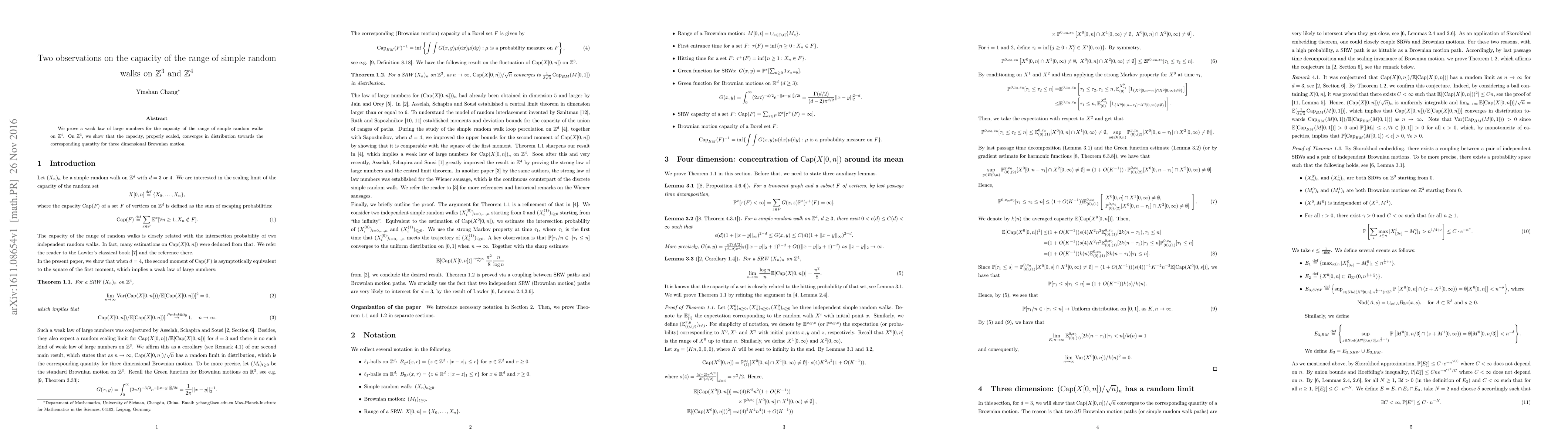 Researchers prove a weak law of large numbers for simple random walks in 3D and 4D space, showing capacity converges to that of 3D Brownian motion in 4D.